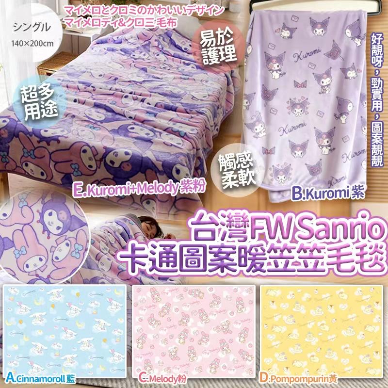 *台灣 FW Sanrio 卡通圖案暖笠笠毛毯* 🕔截數日期 : 2025年11月17日 💰$88/張, 2張或以上$78/張 📦預計到貨: 2月中旬 5款選🌈 A.藍色 Cinnamoroll B.紫色 Kuromi C.粉色 Melody D.黃色 Pompompurin E.紫粉色 Kuromi+Melody ❤️好靚呀 ❤️勁實用 ✔️優質觸感超柔軟 這種材料輕盈蓬鬆,會讓你想整天躺在床上 ✔️多功能用途 豐富了臥室或沙發的裝飾,提供一個舒適的地方,可以享受放鬆的時刻 ✔️易於護理 由於其厚實耐用的材料,毯子可以在冷水中機洗,即使在幾次洗滌後也能保持其形狀和顏色 📌尺寸 : 140*200cm(+-10) ⚠️人手量度,可能會有偏差 ⚠️温馨提示:基於衛生問題,除品質問題外,其他理由一律不設退換,敬請留意