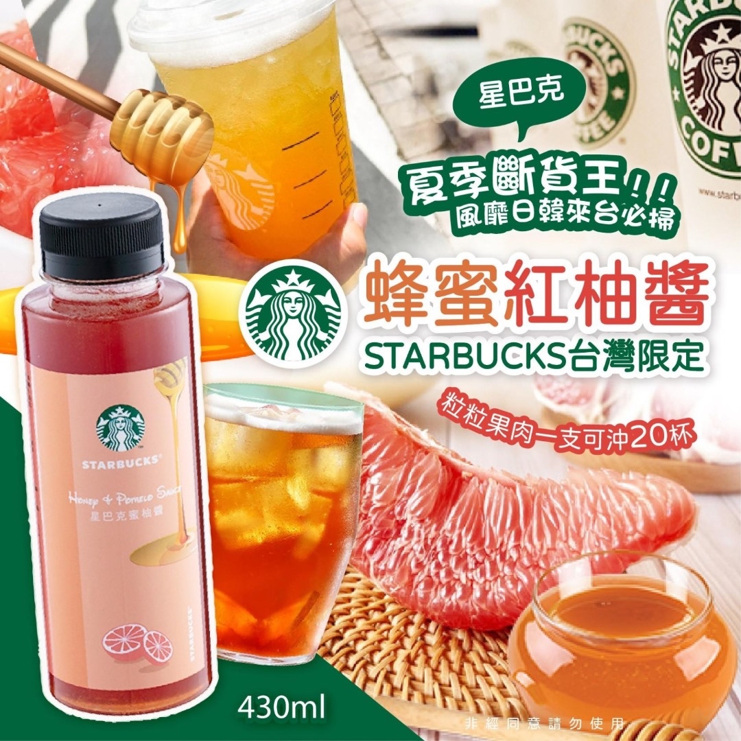 *台灣 starbucks 限定蜂蜜紅柚醬* ❌❌截單日:2/6/2024 💰$98/支;2支以上$88/支 🚚🚚到貨日:7月下旬 每年夏天🌞一推出即賣斷市😱今年要快手 係starbucks買一杯🥤tall size都要$155台幣 自己沖一杯只係幾蚊港幣😆超抵飲 店員話好多✈️韓國🇯🇵日本遊客都會掃貨 每次只需加入15-20ml配上☕紅茶😍 就可自製starbucks幾十蚊一杯既蜜柚茶‼️‼️ 唔飲茶既朋友可以加入🥛牛奶或咖啡 非常抵飲👍🏻一支可以沖大概20杯 💡以歐洲紅柚搭配在地柚子果肉、柚子皮,與蜂蜜調和成最剛剛好的甜味,可以拿來放在家中或辦公室自行挑配沖泡,與英式紅茶搭在一塊兒,更是散發出馥郁高雅的香氣😋 -產地:台灣 -規格:430g -保存期限:生產日起計8個月 📣每批效期略有不同以實際為主。 📣效期:商品銷售速度快,每批都是最新生產,依實際出廠為主。 📣包裝:依季節或每批生產可能略有不同。 -保存方式:避免陽光直射,請置於陰涼乾燥。 -過敏原資訊:本產品與其它含有魚類、亞硫酸鹽、芒果、堅果與芝麻種子的產品於同一工廠生產,食物過敏者請留意。