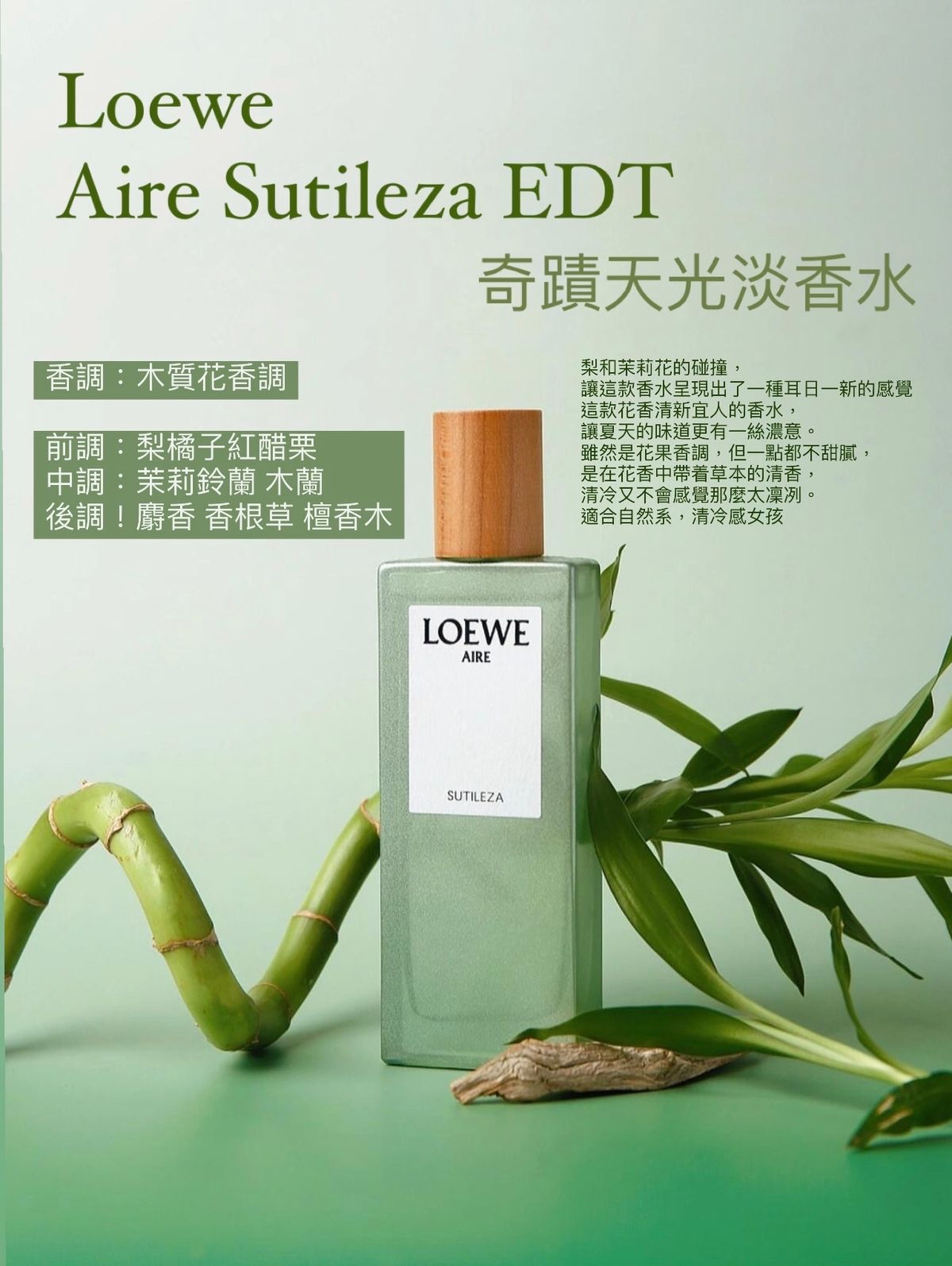 *店主推薦🩷用到空瓶香水* *Loewe Aire Sutileza EDT 奇蹟天光淡香水* ‼️售完即止 心動價😍 50ml 💰$560 /支 100ml 💰$680/支 🚘2 ~3星期到貨 梨🍐和茉莉花的碰撞,讓這款香水呈現出了一種耳日一新的感覺。 這款花香清新宜人的香水,讓夏天的味道更有一絲濃意。 雖然是花果香調,但一點都不甜膩,是在花香中帶着草本的清香,清冷又不會感覺那麼太凜冽。 適合自然系,清冷感女孩。 香調:木質花香調 前調:梨橘子紅醋栗 中調:茉莉鈴蘭 木蘭 後調!麝香 香根草 檀香木