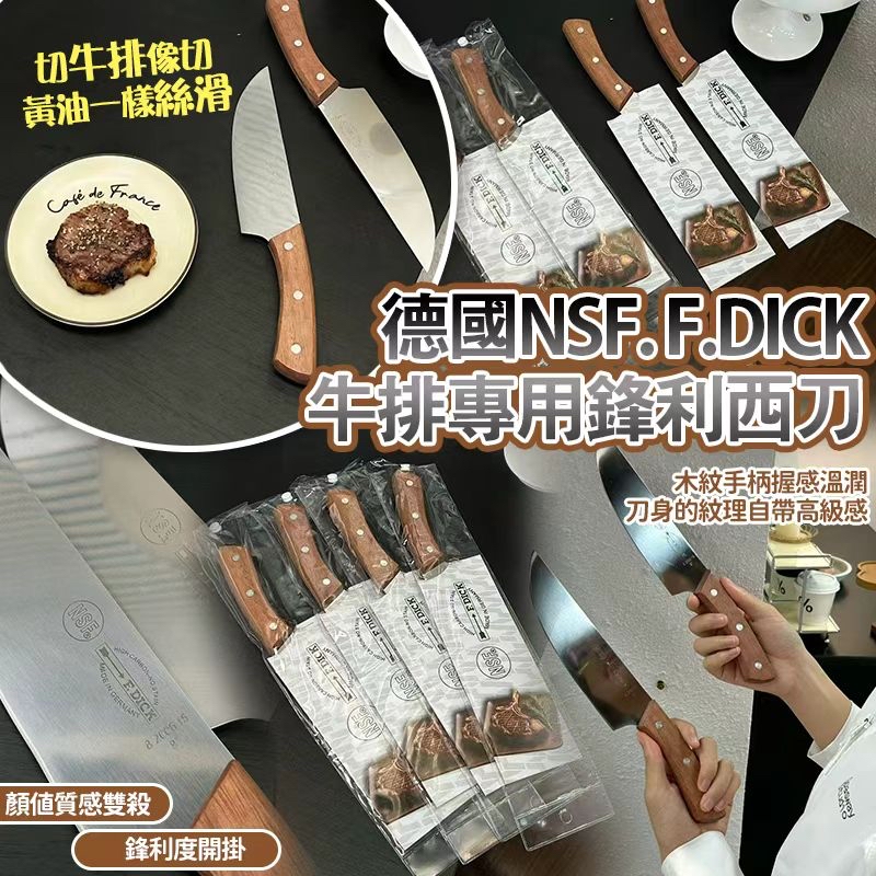 *德國 NSF. F.DICK 牛排專用鋒利西刀* 🕔截數日期 :2025年11月3日 💰$39/件 📦預計到貨: 2026年1月下旬 家中中意食牛排既你,岩哂啦~ 鋒利度No.1 ~~~加上木紋手握位,滿滿高級感 ✅顏值質感雙殺 木紋手柄握感溫潤,刀身的紋理自帶高級感,往餐桌上一擺,普通晚餐都變精緻西餐 ✅鋒利度開掛 切牛排像切黃油一樣絲滑,連帶着肉汁都鎖得更完整,再也不用“鋸牛排”破壞口感 ✅適配度拉滿 不管是煎牛排、切面包還是處理食材,一把頂N把,廚房收納都省空間 ▪尺寸 : 30x5cm ▪重量 : 147克