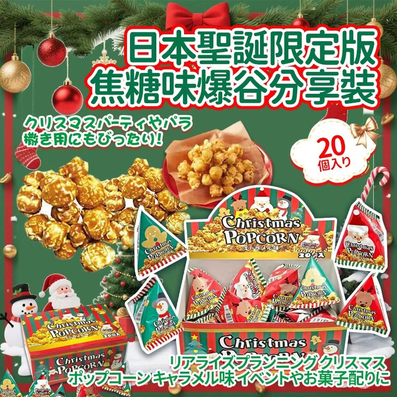 *日本聖誕限定版焦糖味爆谷開心分享裝 (1盒20入)* 🕔截數日期 : 2025年11月12日 💰$85/盒, 2盒或以上$75/盒 📦預計到貨: 12月中旬 呢款年年熱賣爆晒單💥💥每年都勁受歡迎大家唔好錯過📣📣 🎅🏻聖誕🧑🏻🎄特集 👍🏻產品特點👍🏻 🌀以聖誕節為主題的3角椎體包裝,內含焦糖爆米花♪ 🌀可愛的外盒還可用作展示盒♪ 📏尺寸📏 🌀外箱尺寸:約H140 x W200 x D90mm 🌀內容量:爆谷 (3.5 克) x 20小包 ▪規格:1盒20入 ▪保質期:生產日起150天