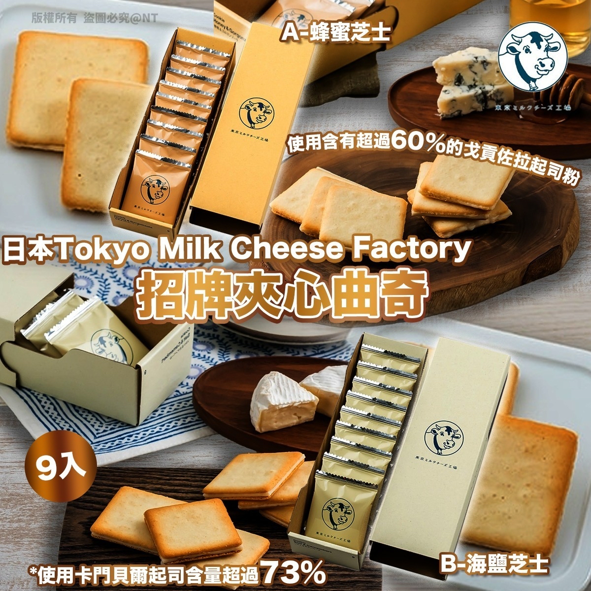 *日本🇯🇵Tokyo Milk Cheese Factory 招牌夾心曲奇9入* 🕔截數日期 : 2025年11月11日 💰$119/盒, 2盒或以上$109/盒 📦預計到貨: 2026年2月中旬 2款選😋 A. 蜂蜜芝士 B. 海鹽芝士 🧀🧀芝士控召集📢📢🥛牛奶➕芝士🧀雙劍合璧⚔ 安在家中🏡都可以享用到啦🥹~~ 甜點中🔝最無敵嘅組合一定喺🥛牛奶➕芝士🧀,無人能抗拒🤤的奶香攻擊 👏🏻👏🏻正正就喺Tokyo Milk Cheese Factory嘅主打🦾 嚴選來自「北海道的香濃鮮牛乳」與「法國的濃郁芝士」為基礎 混合其他食材💥創造多款夾心曲奇,😋濃郁酥脆,完全停唔到口😝 🍯蜂蜜芝士🧀 西班牙迷迭香「蜂蜜」搭配「戈貢佐拉起司」*創造的清爽甜香 比海鹽味略甜,但尾韻依然仲有淡淡的鹹香 「*使用含有超過60%的戈貢佐拉起司粉」 🧂海鹽芝士🧀 必入手的鎮店之寶,使用法國蓋朗德「海鹽」➕北海道牛奶混合的麵糰 中間夾著「卡門貝爾芝士」*,混合出鹹甜鹹甜的滋味 減低芝士的甜膩感,令豐富的層次,點食都唔會厭嘅味道 「*使用卡門貝爾起司含量超過73%」 ⚠本產品含小麥、雞蛋、乳製品、大豆、蜂蜜(A),過敏者慎用⚠ ⚠A款含有蜂蜜,1歲以下嬰兒和過敏者請勿食用⚠ ▪內容:一盒9入 ▪原產地:🇯🇵日本製造 ▪有效期:生產日起1年 ▪保存方法:在室溫下保存,避免陽光直射、高溫、潮濕的地方。
