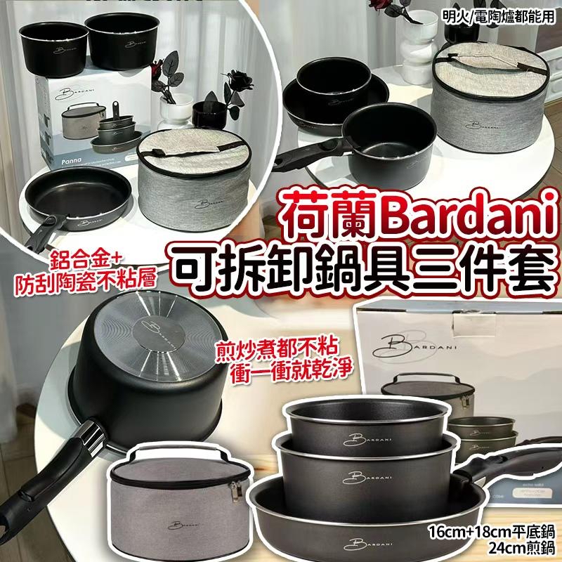 *荷蘭 Bardani可拆卸鍋具三件套* 🕔截數日期 : 2025年11月12日 16cm+18cm平底鍋+24cm煎鍋 ❌❌原價 $499/套❌❌ 💰$128/套 📦預計到貨: 2026年2月中旬 鋁合金+防刮陶瓷不粘層,煎炒煮都不粘,衝一衝就乾淨; 明火/電陶爐都能用(注意不能電磁爐哦) 食的容量剛好夠日常~ 荷蘭品牌的實用設計,不管是廚房收納還是偶爾戶外用,都適配度拉滿! 重量2025.5g