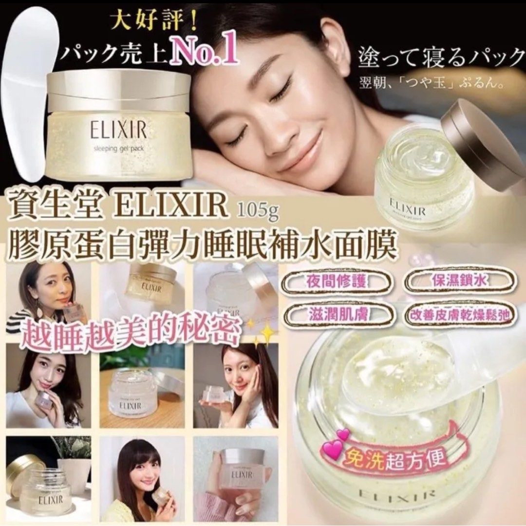 *資生堂 Elixir 膠原蛋白彈力睡眠面膜- 金色款105g(日本本土版)* 優惠價💰$145/樽,2樽以上$139/樽 🚗2-3星期到貨 一邊睡覺一邊美容兩不誤✨ 膠原蛋白美容液成分的啫喱整晚包裹肌膚,讓皮膚瞓緊覺都吸收到豐富膠原蛋白🧡每朝起身皮膚更加緊緻有彈性