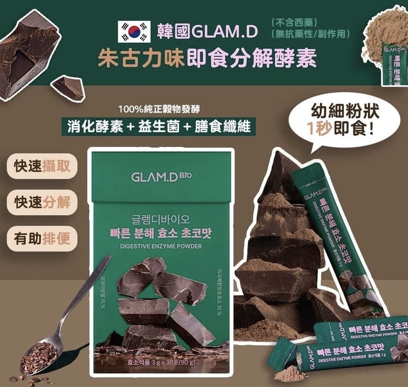 *雙十一優惠‼️Glam D 朱古力酵素 14條裝* ‼️數量有限‼️售完即止 HKTVmall$12x❌❌ 店主優惠💰$79/盒,2盒或以上$73/盒 🚗供應商現貨, 2-3星期到貨 每秒賣出1包,只有10kcal嘅濃郁香甜朱古力粉!食完飯直接倒入口,即時分解碳水化合物和脂肪,大餐後1️⃣秒消除罪惡感。選用天然穀物發酵,唔洗擔心有不良化學成份~同時富含多種蔬菜植物營養素,有效舒緩腸胃脹氣不適。 ✅15%荷蘭產可可粉+益生菌+多種維生素+膳食纖維 ✅幼細粉末狀酵素能被快速吸收,有助快速分解 ✅兒童及長者服用時,建議慢慢少量倒入口內,分次食用 ❌不含西藥,100%純正穀物發酵酵素 ❌NO抗藥性/副作用 食用方法:餐後1包,撕開包裝即可食用。(可根據個人需求隨時服用,建議攝取量一日1-2包)