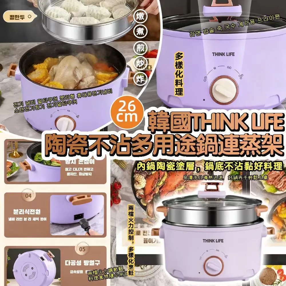 *韓國 THINK LIFE 陶瓷不沾多用途鍋連蒸架 26cm* 🕔截數日期 :2025年10月20日 ❌韓國賣緊$299❌ 💰$95/個, 2個或以上$89/個 📦預計到貨: 2026年1月下旬 方便~~~一個pot直接可以煲湯煮食,仲正梗係可以火鍋,可以蒸/煮/炒/炖/煲湯,超多用途。 鍋採用了不沾底陶瓷,可以多用途用,容量夠大,仲送埋蒸架,媽咪們想係屋企點煮都得,超方便~ 💟極簡美型系列 陶瓷不沾鍋塗層 一機多用 💟燉、煮、煎、炒、炸 ,多樣化料理 適用多種美食料理 火鍋/油炸/炒菜/滷肉/早午餐/炊飯等 💟不沾鍋 內鍋陶瓷塗層,鍋底不沾黏好料理 易清洗且導熱迅速,好鍋再手輕鬆上桌 💟兩檔火力控制,多樣化烹飪 適用煎/煲/煮/蒸/炒/鍋物 兩檔火力調節鈕,料理食物隨心所欲 💟極簡設計 啟動指示燈,電源啟動清楚明瞭 雙耳木紋提把,做菜煮飯不燙手 使用木紋提把搭配,質感再升級 透明玻璃鍋蓋設計,烹調狀況一目瞭然 ▪尺寸:26cm ▪中國代工, 英規三腳插