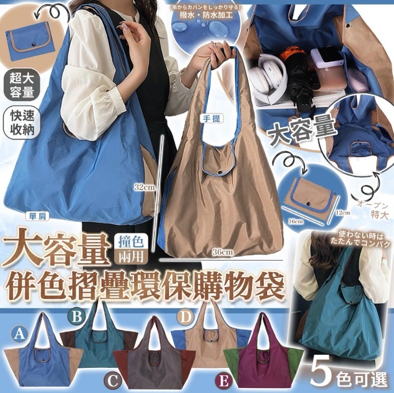 *🇯🇵日本直送大容量併色摺疊環保購物袋* 🕔截數日期 : 2025年10月19日 💰$35/個, 2個或以上$32/個 📦預計到貨: 12月下旬 5色選🌈 A. 藍+卡奇 B. 孔雀綠+啡 C. 啡+紅 D. 卡奇+藍 E. 紅+綠 👏👏香港人出街必備👍呢個大容量環保袋真係太方便啦👍 無論係🧳返工、🛫旅行、定係🍆去街市買餸,一個袋搞掂🙌 ✨主要特點: ✅大容量設計:長40cm x 寬26cm x 高32cm ✅防潑水耐磨面料:落雨唔怕☔️,耐磨耐用👊 ✅輕身, 只有125g,夠輕便!🤩 ✅可摺疊收納:摺埋後只有手掌咁大,方便攜帶👏 🎒可單肩、可手提手挽,方便實用,滿足你日常活動所需