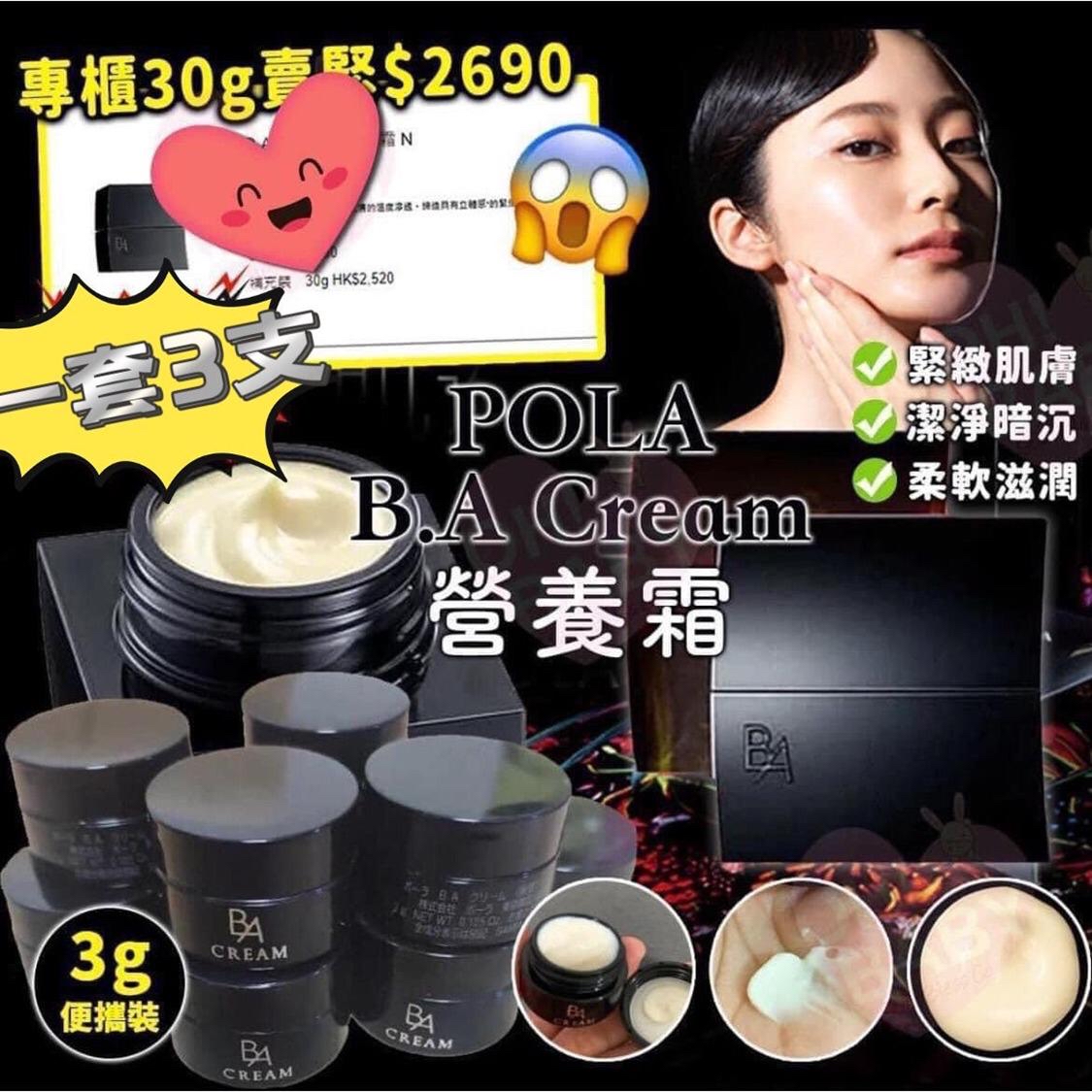 跌破底價‼️‼️‼️ *🇯🇵POLA B.A Cream 營養霜/抗糖面霜3g (1套3件)* ‼️售完即止 ❌專櫃賣緊$2690/30g❌ 店主優惠💰$79/套, 2套或以上$ 74/套 🚗2~3星期到貨 日本貴婦品牌POLA嘅B.A Cream真係好好用呀‼️ 專櫃30g要$2690😱 我哋而家3g低至$7X/3個 日本✨POLA 抗糖化系列✨好多女明星都用佢架🥰 呢款B.A Cream添加咗全新仙人穀迷迭香複合精華 幫助肌膚達到離子平衡,並提升滲透力🆙 帶給肌膚健康血色 #維持緊緻飽滿3D立體輪廓 淡淡香味😌cream 狀質地柔滑唔油膩👍🏻 滲透性好好,輕輕在臉上按摩好快吸收 吸收後感覺皮膚好柔軟滋潤,緊緻持久 好似有層薄薄嘅保護膜與肌膚融為一體咁🥰 🉐為你打造充滿活力的緊緻肌膚 ✅幫助肌膚對抗及潔淨暗沉、受糖化的角質層 ✅回復自然緊緻的柔軟光澤膚質