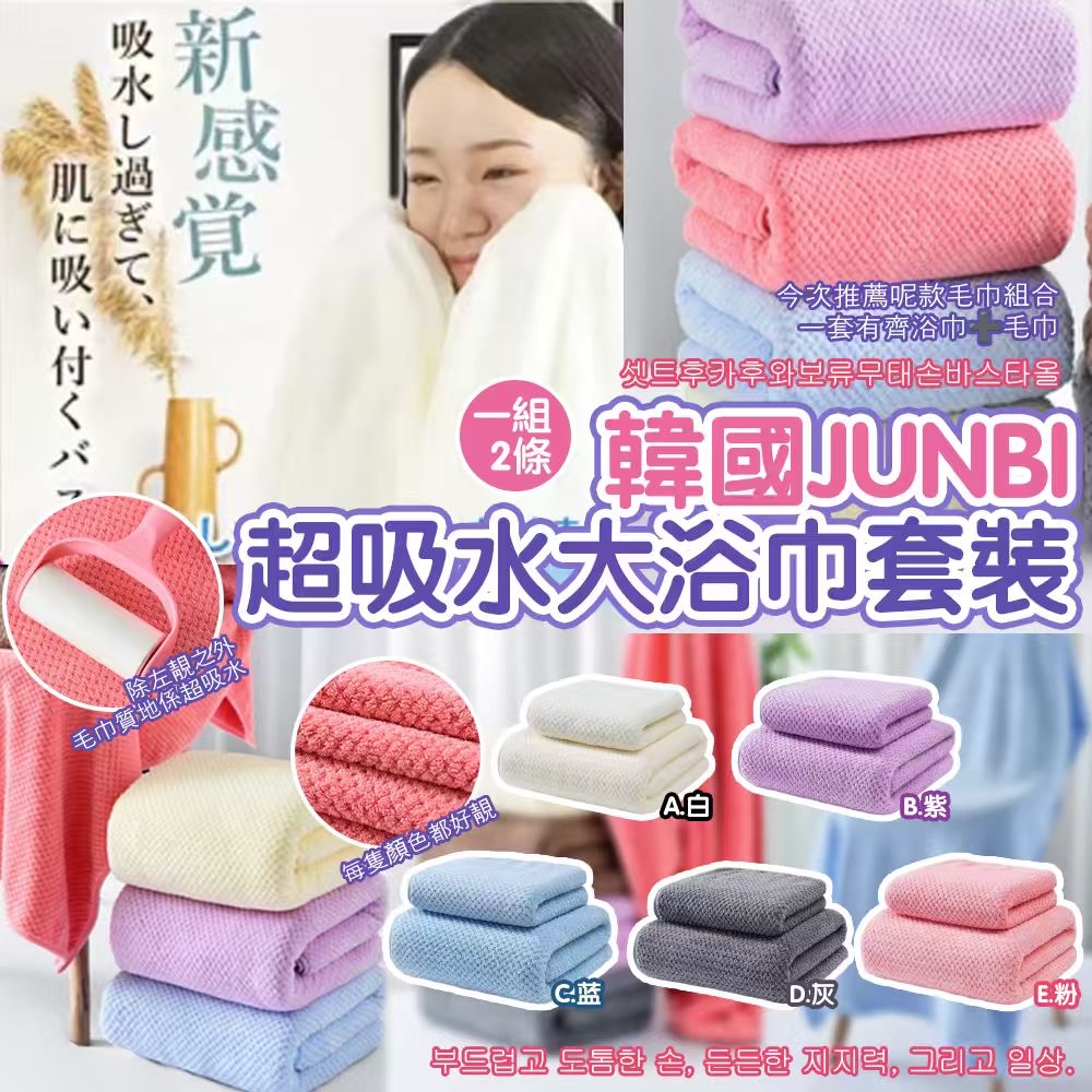 *🇰🇷韓國 JUNBI超吸水大浴巾套裝(一套2條)* 🕔截數日期 :2025年10月16日 💰$48/套, 2套或以上$38/套 📦預計到貨: 2026年1月下旬 5色選🌈 A. 白色 B. 紫色 C. 藍色 D. 灰色 E. 粉色 珊瑚絨既巾✨好厚身,沖涼係一下吸水 🙈比普通毛巾吸水快好多~~🌈 今次推薦呢款毛巾組合 一套有齊浴巾➕毛巾 每隻顏色都好靚❤️ 除左靚之外,毛巾質地係超吸水 小編自己都用緊呀🙌🏻 💁🏻♀️比起普通毛巾更強吸水力 而且快乾又唔重 毛巾洗面抹頭髮真係一流🆒 浴巾又軟又舒服岩哂幼滑嘅皮膚💯 ✅吸水力強 ✅快乾 ✅柔軟親膚 ✅多色選擇 ✅情侶/夫妻必選 尺寸📏 🔹毛巾 : 35 x 75cm 🔹浴巾 : 70 x 140cm