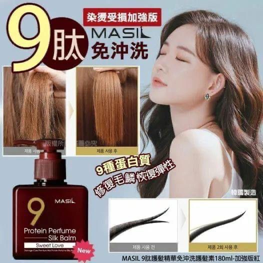 *🇰🇷韓國MASIL 9肽護髮精華免沖洗護髮素180ml-加強版紅* ‼️售完即止 💰$65/瓶 🚘約2~3星期到貨 ✳️染燙受損加強版 韓國MASIL 繼8秒髮膜後 ~~ 再一次推出的護髮新品甜蜜愛戀香氛的味道😍😍 塗抹在髮上不僅能✨護髮✨保濕💕還能讓整天頭髮.香氣迷人🥰☺️ 🌀九種蛋白質成分:有助於修復受損毛麟片 🌀解決頭髮分岔乾枯跟易斷問題 使用起來清爽不油膩,讓秀髮亮麗動人,持久香氣一整天哦!!❤️😍😘 吹髮前使用能更有效 防止熱力對頭髮帶來的熱損傷,降低熱風筒、捲髮棒、電髮夾等工具帶來對髮絲的傷害 ✅✅使用方式: 擠出時為半透明膏狀形態,手心互搓後隨即液化,抹在頭髮上吹乾即可! 吹頭髮前使用!阻止頭髮因為過度受熱而損傷✨ 產地:🇰🇷韓國製造