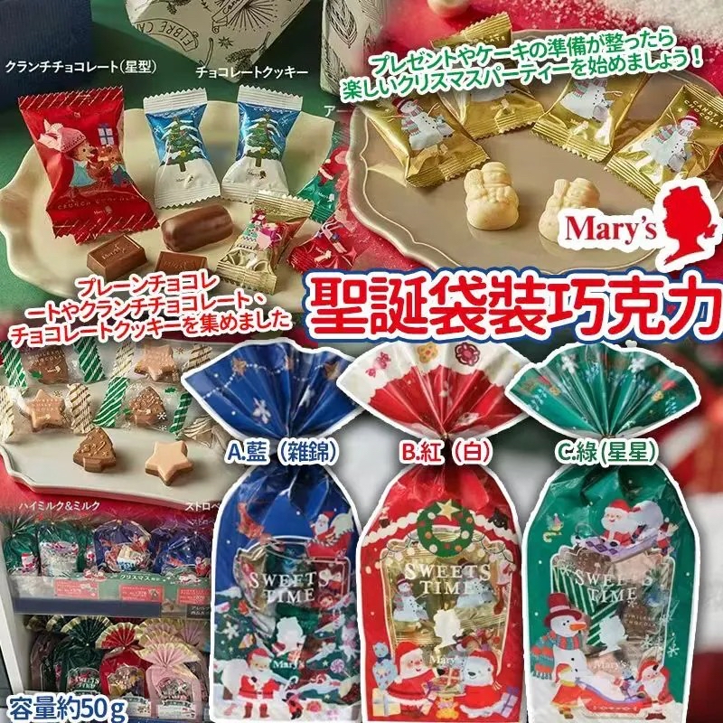 *🇯🇵日本直送🎄MARY'S 聖誕袋裝巧克力 50g* ‼️ 11月14日截單 店主優惠💰$62/包,2套或以上$56/包 🛬12月初至中到貨 這個品牌的朱古力係超級好食 好食又唔貴🎁是日本多年熱銷難買既商品之一 有以下款式🌈: A.藍款 B.紅款 C.綠款 -規格 : 約50g (每包9粒左右) -產地 : 🇯🇵日本 賞味限期2026-2