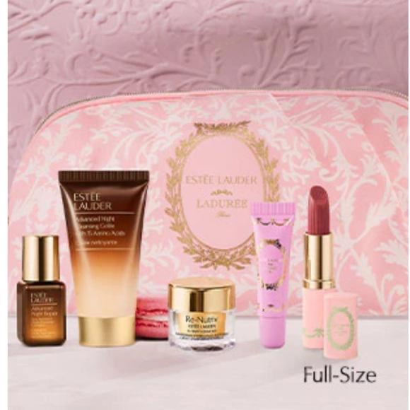 *2025年新款Estee Lauder 雅詩蘭黛2025年新款6件套體驗裝* ‼️ 只有40套, 售完即截 優惠價💰$220/套,2套以上$215/套 🚘2-3星期到貨 套裝包括: ①Re-Nutriv 極緻黑鑽塑顏面霜 (清爽) 7ml ②小棕瓶精華 7ml ③小棕瓶氨基酸潔面30ml ④Estée Lauder x Ladurée 限量版 420# 正裝唇膏3.5g ⑤Estée Lauder x Ladurée 限量版唇蜜中樣7ml ⑥Estée Lauder x Ladurée 限量版化妝袋 Estée Lauder與法國經典馬卡龍精緻甜點品牌Ladurée將高級彩妝與精緻講究的法式糕點巧妙結合, 攜手呈獻充滿夢幻糖果色彩的聯乘系列,讓人彷如置身粉嫩的法式夢幻世界。 今次套estee lauder 小樣套裝真係超靚💕💕💕 有3款都係Estée Lauder x Ladurée限量版來, #420色唇膏仲要係貨裝!! 真係超值🩷🩷🩷
