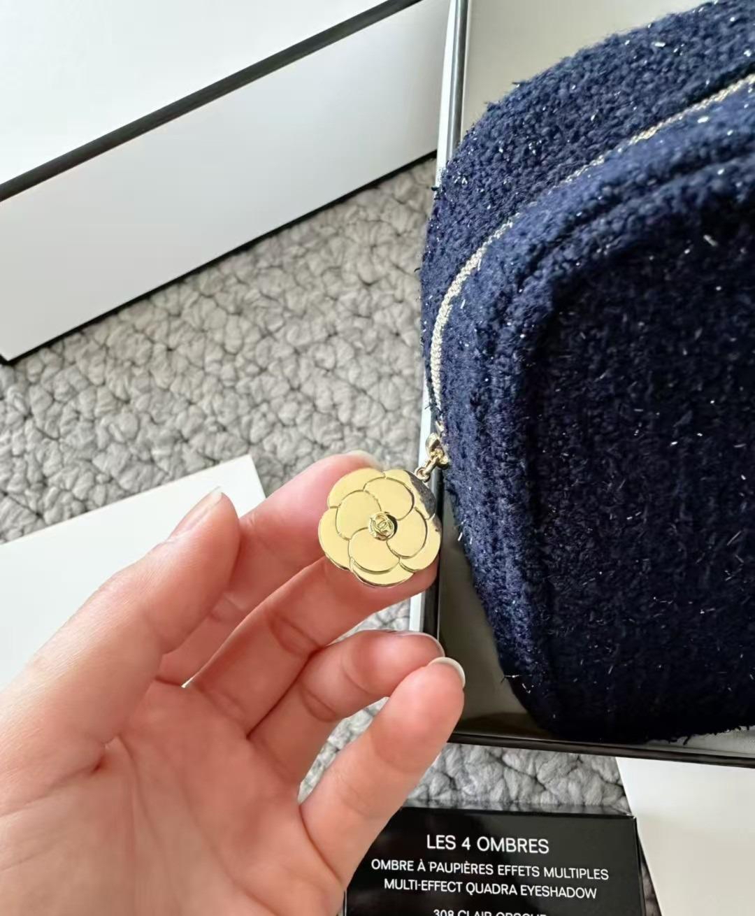 *Chanel Beauty💙2025 🎄聖誕限量Tweed深藍化妝袋(附藍色原裝盒)* ‼️數量有限‼️售完即止 😍優惠💰$128/個 🚗2-3星期到貨 這款 *Chanel Beauty 深藍Tweed化妝包* ,可以形容為一種低調奢華的藝術品,既有品牌的經典優雅,也帶點現代感的俏皮 *✨ 風格形容* - *深藍色Tweed面料* :像夜空般沉穩,閃爍著微妙的金銀絲光澤,讓人聯想到星辰在黑夜中閃爍。 - *質感細膩* :Tweed布料帶有立體紋理,手感溫潤,視覺上有層次感,不只是化妝包,更像一件精品配件。 - *金屬細節點綴* :拉鍊用上經典山茶花Logo,與深藍色形成高級對比,增添精緻感。 - *尺寸適中* :既能裝下日常美妝用品,又不失輕巧便攜,適合放入手袋或旅行使用。 尺寸 :約20x12x6cm