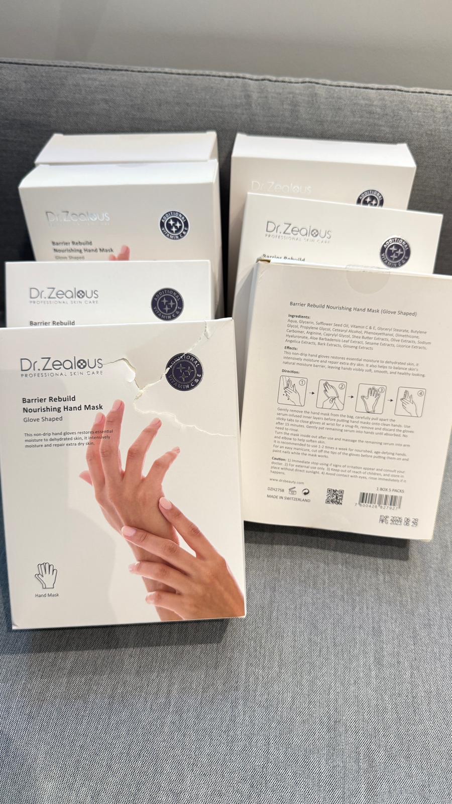 *Dr Zealous 瑞士 防護滋養精華潤手膜(Made in Switzerland)* ‼️少量現貨‼️超抵‼️ *超正推薦*係呀 *超好用,用完即白,即滑* ✨由於紙盒包裝有點破損 原價$78❌❌ *😱店主特價$59/盒* 🚘一星期到貨 超正嘅手膜,整開指甲💅嘅用家經常都用呢款嘅Handmask唔洗介紹已經知係正嘢👍,HKTxx賣成$2xx盒😱,而家半價就買到,仲等咩,仲唔拿拿聲入貨,數量有限,限量100盒,售完即止。 採用左不滴水手套,手膜可以為乾燥皮膚恢復水份,同時滋潤及修復乾燥嘅雙手👋🏻 而家成日揸消毒搓手液,搞到隻手勁乾勁多紋😣 用咗呢隻hand mask 真係覺得隻手好潤好滑,仲要白左好多✌🏻✌🏻✌🏻✌🏻✌🏻 只要20分鐘就可以有對白白滑滑嘅手😎😎😎 (PS:帶住手套都可以玩電話💜) 成份: 水,甘油,紅花籽油,甘油硬脂酸酯,丁二醇,丙二醇,鯨蠟硬脂醇,苯氧乙醇,二甲矽油,卡波姆,精氨酸,辛酸甘油,乳木果油提取物,橄欖提取物,海藻酸鈉,葉提取物,芝麻提取物,甘草提取物,當歸提取物,桑樹提取物,人參提取物 用法: 從包裝袋中輕輕取下手套型護手膜,拉開注入精華的內層,然後將手膜套進潔淨的手上。使用膠紙輕輕貼合手腕上的手膜,把手指緊貼手膜,待15分鐘後除下手膜。輕拍剩餘在手中的精華直至吸收。無需沖洗。 使用後可將手膜內翻,然後將剩餘的精華液於手臂和肘部上按摩,幫助軟化皮膚。 建議每週使用1-2次,以滋養雙手。如要同時修甲,請在戴上手套之前剪掉手膜的尖端,方便在護理雙手時同時塗指甲。 *2026/06到期* 1box/5pack Made in Switzerland