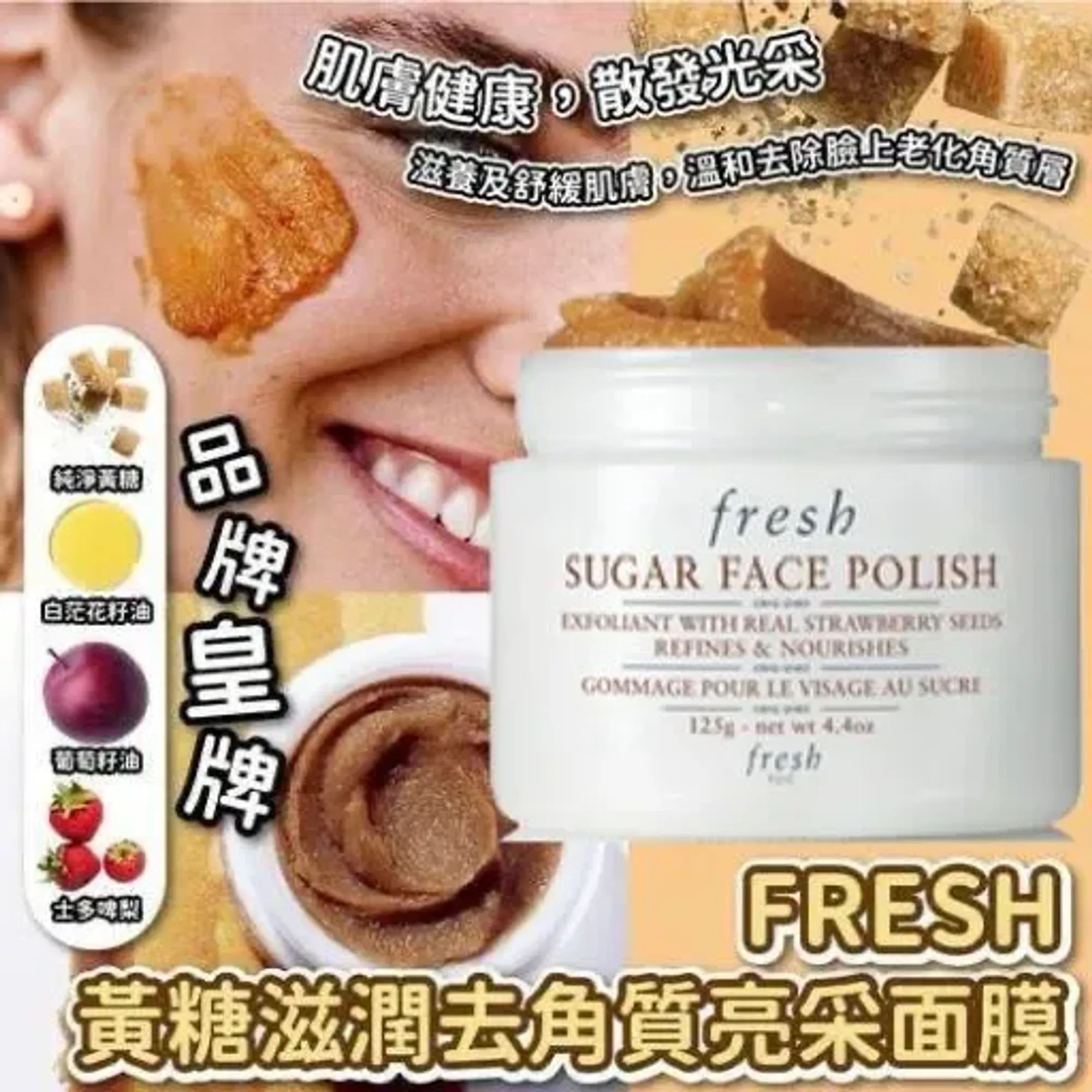 *入秋唔少得買呢款💕* *Fresh 黃糖滋潤去角質亮采面膜 (125g 貨裝)* ‼️售完即止 ❌原價 $560/樽❌ 店主價惠💰$278/樽,2樽或以上$268/樽 🚗2-3星期到貨 品牌皇牌‼️超好用既產品 我們的皮膚每天都有角質層不斷堆積,令肌膚變得粗糙暗啞,影響肌膚吸收😔,不論你是屬於偏乾還是偏油性肌膚,每星期最少兩次去角質護理是不可缺少,完成護理後皮膚回復柔軟有光澤,而且有助日常產品吸收,化妝亦貼服自然,記得不要懶惰啦~ 這個面膜只需使用一次,面部即時神采飛揚。🥇 可滋養及舒緩肌膚,溫和去除臉上老化角質層,使肌膚健康,散發光采,不會造成疼痛或紅腫,可每天使用,適合任何膚質。 純淨黃糖結晶可溫和地去除面上老化角質層,野生士多啤梨粿粒含豐富維他命C,能保護和修護肌膚,糅合白茫花籽油、葡萄籽油及茫果油等修護精華,為皮膚提供源源不絕的水分和營養。 使用方法: 潔面後,塗抹在濕潤的肌膚上,輕輕按摩 30 秒,避開眼部四周,直至黃糖完全融化。