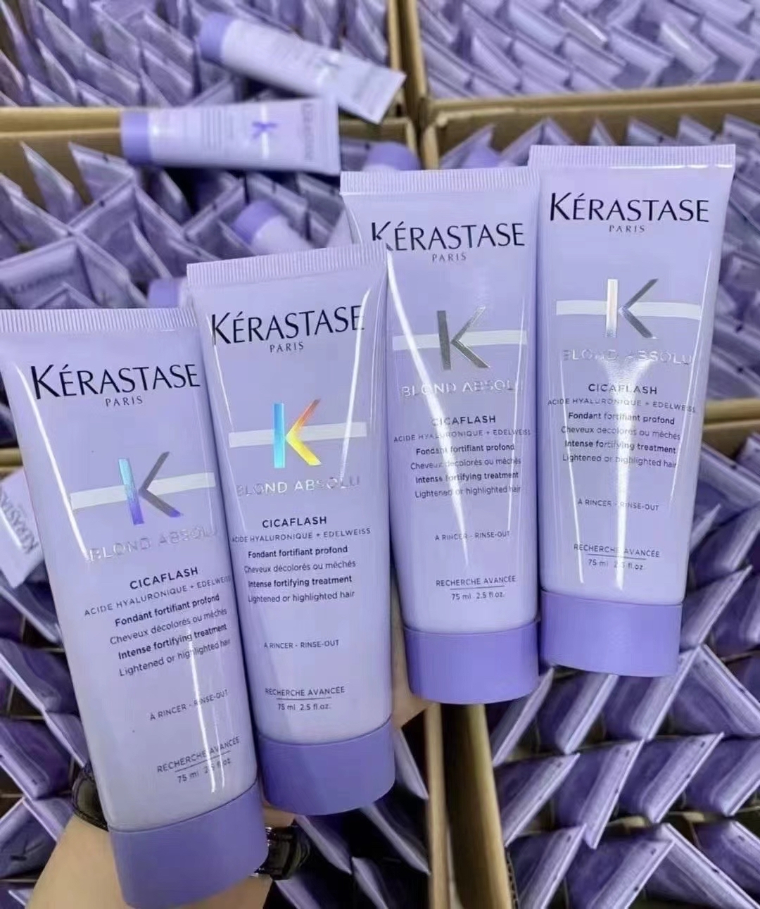 *Kérastase 法國卡詩漂染修護護髮露75ml* ‼️有數即報, 售完即截 ❌原價$350/250ml❌ 💰$58/支, 2支以上$55/支 🚘2-3星期到貨 Kérastase 巴黎卡詩的Blond Absolu Cicaflash 護髮素,這是一款針對漂染或挑染髮絲的強化護理產品。 產品類型: 這是一款輕盈的護髮素,具有髮膜般的修護功效,能深層滋潤並修復受損的漂染髮絲。 主要成分: 蘊含透明質酸和雪絨花,能強化髮纖,防止斷裂,同時提供抗氧化保護。 功效: 能即時撫平、強化和軟化敏感的淺色髮絲,同時提供強效彈性,使頭髮柔軟、水潤且輕盈有光澤。 使用方法: 洗髮後,取適量塗抹於髮中至髮尾,避免髮根,停留2至3分鐘後徹底沖洗。