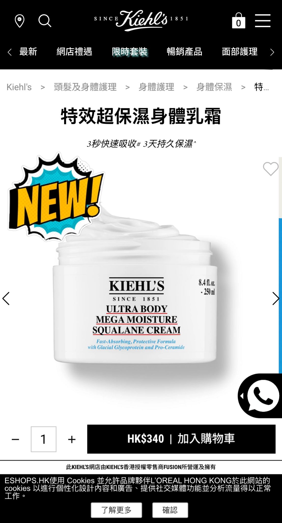 *Kiehl’s 特效超保濕身體乳霜 250ml*