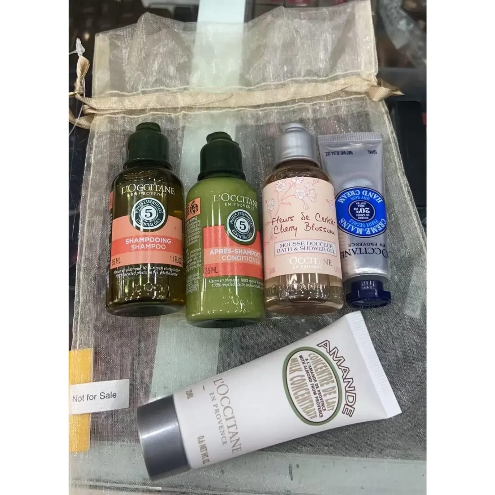 *L'occitane 歐舒丹小樣皇牌五件組旅行裝(有束口袋)* ‼️售完即止 優惠價💰$80/套,2套或以上$75/套 🚗2-3星期到貨 套裝包括: 乳木果護手霜10ml 櫻花沐浴露35ml 杏仁身體乳20ml 草本洗髮精35ml 草本護髮素35ml