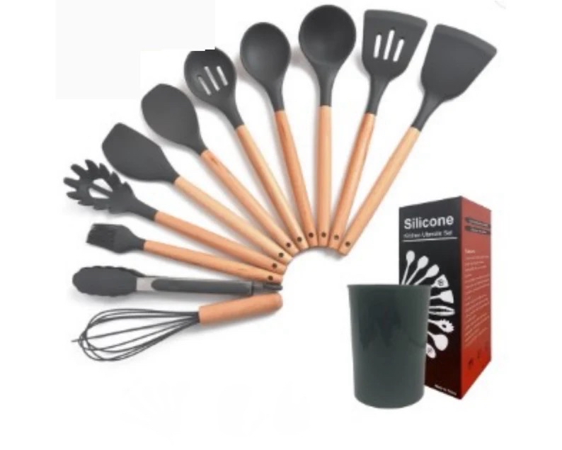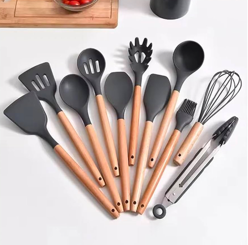 *Silicone Kitchen Utensils Set 矽膠廚房用具12件套裝(深灰色)* ‼️少量現貨‼️售完即止 快閃價😱💰$58 🚘約1星期到貨 帶木柄的食品級矽膠 Non-stick, BPA-free, FDA approved 耐熱高達230℃ or 480°F 連Plastic Holder 共12件
