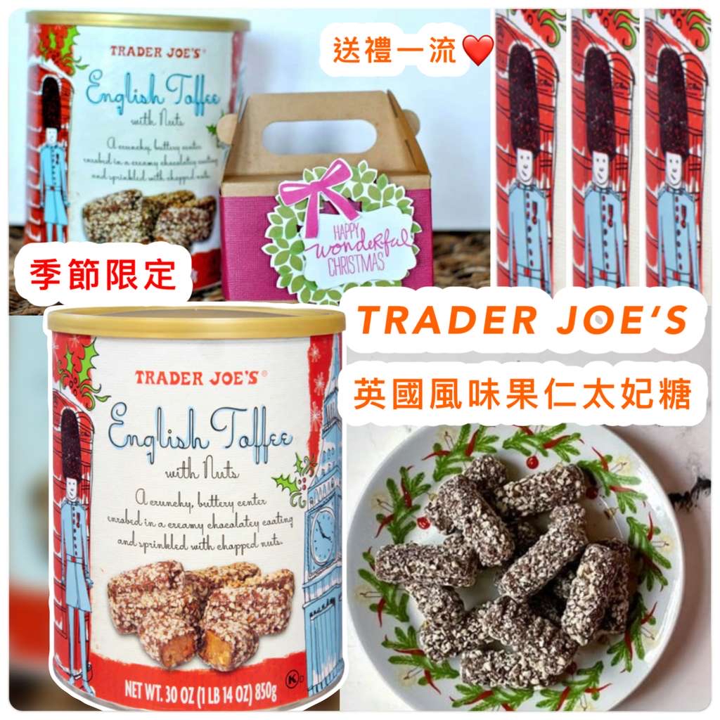 *TRADER JOE’S 英國風味果仁太妃糖 850g* 🕔截數: 11月15日/ 售完即止 💰$199/罐, 2罐或以上$195/罐 📦預計到貨: 12月中旬 季節限定🔥大大罐🤤 實在太好味‼️🤤 呢款香脆可口既太妃糖採用傳統工藝製作 選用優質原料,包括新鮮奶油、加州上等杏仁和純正香草。 🔥傳統的糖果鍋中用明火慢煮而成 烹調過程中,會加入杏仁碎和腰果碎,增添額外的酥脆口感‼️ 每塊太妃糖上裹上一層朱古力🍫,並在每塊糖上撒上碎堅果。 真是太美味了‼️ 外型超適合送禮🎁香港🇭🇰未必度度有得賣 朋友🧑🤝🧑親人收到一定特別開心·😄 ▪規格:850g ⚠️鐵罐運輸途中,有機會刮花或撞凹,完美主義者慎拍,下單後不設退換