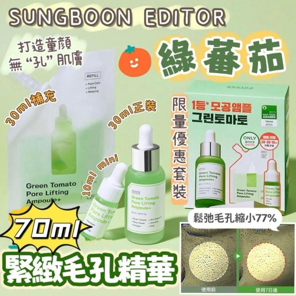 ‼️綠番茄緊緻毛孔安瓶組合 30ml+30ml+送10ml‼️ ‼️售完即止 優惠💰$109/盒 🚘2 ~3星期到貨 🇰🇷韓國Sungboon Editor 綠番茄緊緻毛孔安瓶套盒 30ml+30ml+10ml 回饋粉絲大作戰💗🌟比你去OY買還便宜 這次組合30ml➕30ml➕10ml🟰70ml 🌟Olive Young最新綠番茄套盒 🔥話題未減的緊緻毛孔精華 超值套盒在台灣也買得到💚💚 常常逛彩妝的姐妹們 對綠番茄精華絕對不陌生 在韓國🇰🇷討論度超高的精華 這款銷量在韓國可是連續第一! 韓國這麼難搶的安瓶 現在居然全新推出了套盒組 能一次擁有如此多容量的緊緻安瓶 簡直不要太划算😍 🔅綠番茄萃取物 Sungboon Editor專利的豐富綠番茄精華 經歷兩次嚴格萃取的高濃縮綠番茄精華 深層滋養正在受毛孔困擾的肌膚 為了就是讓粗大毛孔更加緊緻光滑 實現自然嫩滑肌!❤️ 🔅敏感肌安心用 洋甘菊、綠茶、薄荷等 有效舒緩敏感肌膚 讓肌膚越抹越美麗✨ #保濕補水 #抗氧化 #抗泛紅發炎 ✅減少毛孔深度、大小 ✅含pha溫和去除角質 ✅減緩毛孔黑色素沉澱 ✅5重玻尿酸保濕肌膚 精華水質地,富含滿滿的綠番茄精華 一抹立馬感受到保濕緊緻!用了真的回不去 連續使用兩週之後緊緻超有感 ❤️怪不得在韓國賣到缺貨
