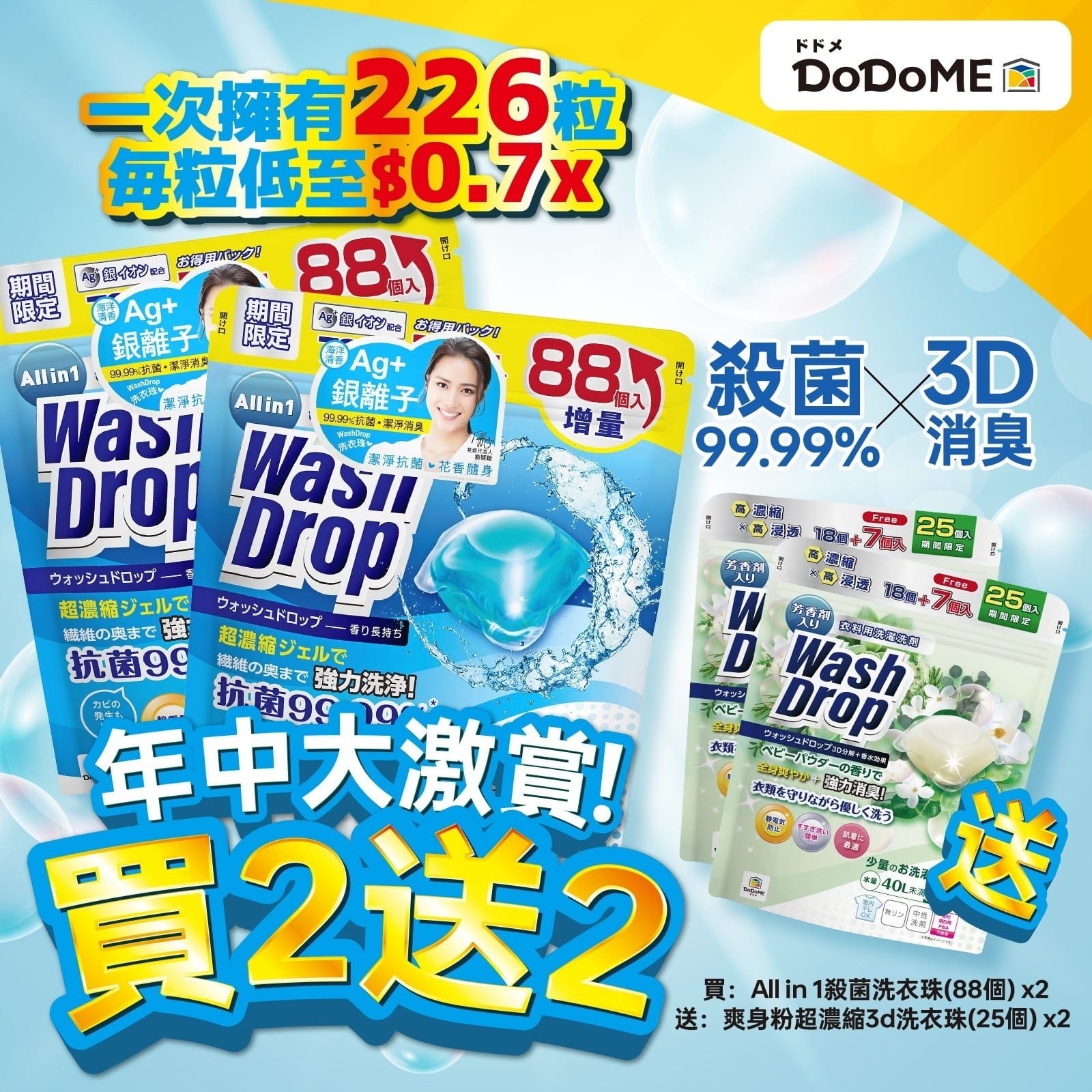 *❗❗年中大激賞❗❗* *勁抵DoDoME洗衣珠買2送2😱* 【_*All in 1 殺菌洗衣珠 (88個)*_】 【_*爽身粉味超濃縮3D洗衣珠(25個)*_】 ‼️ 截單:20/6 ❌團購價:HK$199/1套❌ 店主優惠💰$188/套,2套或以上$178/套 🚗約1~2星期到