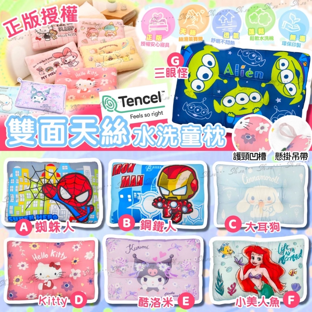 *台灣正版授權雙面天絲水洗童枕* ❌❌截單日:2/5/2024 💰$118/顆;2顆以上$108/顆 🚚🚚到貨日:6月中下旬 天絲材質舒柔🌿,設計釋壓舒眠 嚴選精緻花色,無毒印製😍 🉐採用鬆軟水洗棉製作,疏水性佳 還有設計懸掛吊袋,晾曬收納都便利 🩷台灣正版授權 🩷天絲舒柔 親和肌膚 釋壓舒眠 🩷人體工學 整顆水洗 潔淨安心 -尺寸:45x30x9.5cm±5% -枕芯材質:100%聚酯纖維 -表布材質:50%萊賽爾纖維+50%聚酯纖維 💟圖案: A.蜘蛛人 B.鋼鐵人 C.大耳狗 D.KITTY E.酷洛米 F.小美人魚 G.三眼怪 -產地:中國(台灣正版授權) -規格:45x30x9.5cm±5%