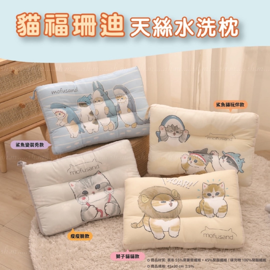 台灣正版授權 Mofusand 天絲水洗童枕 ❌❌截單日:3/6/2024 💰$118/顆;2顆以上$108/顆 🚚🚚到貨日:7月中下旬 天絲材質舒柔🌿,設計釋壓舒眠 嚴選精緻花色,無毒印製😍 🉐採用鬆軟水洗棉製作,疏水性佳 還有設計懸掛吊袋,晾曬收納都便利 🩷台灣正版授權 🩷天絲舒柔 親和肌膚 釋壓舒眠 🩷人體工學 整顆水洗 潔淨安心 -尺寸:45x30x9.5cm±5% -枕芯材質:100%聚酯纖維 -表布材質:50%萊賽爾纖維+50%聚酯纖維 💟圖案: A.鯊魚變裝秀(藍) B.瘦瘦臉(灰) C.鯊魚貓玩伴(米黃) D.獅子貓貓(米黃) -產地:中國(台灣正版授權) -規格:45x30x9.5cm±5%
