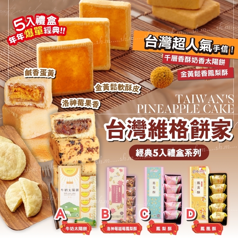 台灣維格餅家經典五入禮盒(1套2盒任選) ❌❌截單日:21/7/2024 💰$108/1套2盒;2套以上$98/套 🚗🚗到貨日:9月上旬 📌1套2盒,口味任選📌 A. 牛奶太陽餅5入 B. 洛神蔓越莓鳳梨酥 5入 C. 鳳梨酥5入 D. 鳳黃酥5入 台灣🇹🇼皇牌糕點🏆維餅家經典五入禮盒 A. 牛奶太陽餅5入 牛奶味香濃,外皮鬆酥多層次,麥芽餡甜而不膩不痴牙, 一吃令人回味。 -規格:50g±5gx5塊 保存期限:生產日起計90天 B. 洛神蔓越莓鳳梨酥 5入 精選台灣台東在地洛神花加入酸甜蔓越莓果乾飽滿內餡的完美契合,長期以來特別是女性顧客最愛的產品之一。在傳統鳳梨酥之外更融入養生元素支持台灣在地農業。 -規格:45g±5gx5塊 -保存期限:生產日起計60天 C. 鳳梨酥5入 外皮與內餡完美比例,精緻烘焙出遠近馳名的維格鳳梨酥,十分受海內外廣大顧客喜愛。 -規格:45g±5gx5顆 保存期限:生產日起計60天 D. 鳳黃酥5入 酥香的餅皮,酸甜的鳳梨餡包著溫潤的蛋黃, 增添了淡淡的微鹹蛋香味,細軟而不黏牙。 -規格:45g±5gx5顆 保存期限:生產日起計60天 -產地:台灣 -規格/佳食用日:如文章標示 -保存方式:避免陽光直射,請置於陰涼乾燥。 -過敏原資訊:本產品含麩質之穀物、牛奶、蛋、大豆及其製品,不適合其過敏體質食用。