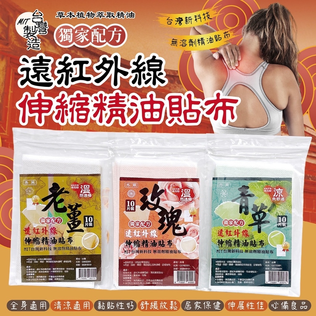 台灣遠紅外線精油貼布10片裝(一組2包) ❌❌截單日:30/5/2024 💰$55/組;2組以上$45/組 🚚🚚到貨日:7月中下旬 專利遠紅外線技術、改善循環、溫熱舒服 伸縮貼布,透氣好貼(關節處也貼的牢) 🌟無化學溶劑精油貼布、不刺激皮膚絕低過敏反應、延展性極高 ,常彎曲皮膚表面 如膝蓋 肩頸 手肘 不脫落 ! 透氣 不悶熱 ! 🌟遠紅外線礦石粉 不管你是辛苦上班族,熬夜讀書的學生,還是為了家忙碌的家庭主婦都必備哦! ⚠️非藥性 、無西藥成份、請勿貼於開放性傷口 款式: A.溫熱通𣈱(玫瑰) B.溫熱通𣈱(老薑) C.清爽舒適(青草) -產地:台灣 -規格:一包10片裝, 一組2包 -保存期限:生產日起計3年 📣每批效期略有不同以實際為主。 📣效期:商品銷售速度快,每批都是最新生產,依實際出廠為主。 📣包裝:依季節或每批生產可能略有不同。 -保存方式:避免陽光直射,請置於陰涼乾燥。 -注意事項: ※請確保將產品放在孩童和寵物接觸不到的地方 ※使用後如有不適,請暫停使用並諮詢專業醫師
