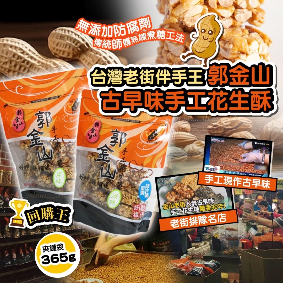 台灣郭金山古早味花生酥365g(袋裝) ❌❌截單日:16/5/2024 💰$59/包;2包$108 🚚🚚到貨日:7月中下旬 郭金山花生糖創店至今已有30年歷史🤩 嚴選台灣雲林特選花生🥜層層把關,吃得安心🉐 傳統老師傅熟練嘅煮糖工法👨🍳,溫度拿捏適中,令麥芽糖完整包覆花生口感香酥不黏牙, 完完全全呈現台灣最地道風味💯🎊 🌟非油炸 🌟無人工香料 🌟手工製作 ❣️寄送過程中多少會碎,介意者請勿下單,謝謝❣️ -產地:台灣 -規格:365g -保存期限:生產日起計60天 📣!!!非到港還有60日,還需運送時間,無法接受短效請勿下單。 📣每批效期略有不同以實際為主。 📣效期:商品銷售速度快,每批都是最新生產,依實際出廠為主。 📣包裝:依季節或每批生產可能略有不同。 -保存方式:避免陽光直射,請置於陰涼乾燥,暫時不吃或沒吃完的,堅果類食品請冷藏保存並儘早食用。 -過敏原資訊:本產品含麩質之穀物、花生、大豆及其製品,不適合其過敏體質食用。