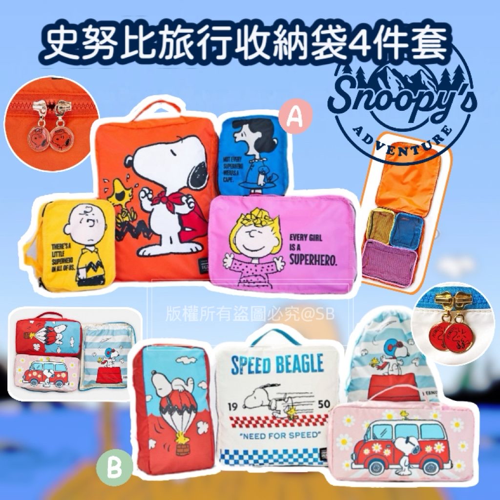 史努比旅行收納袋4件套裝 ❌❌截單日:17/7/2024 😍正呀‼️去旅行有呢4件套, 個喼即刻整齊曬‼️ 超實用‼️ 1套4件,為起最平$17一件😱 💰$78/套;2套以上$68/套 🚗🚗到貨日:8月下旬 去旅行最怕個喼唔夠格數😞 點執都係散散亂亂😔 用過呢類收納袋你一定返唔到轉頭😆 4件唔同SIZE, 可以收納好多濕碎小物😆 使用防水防污布料,挺身結實,容易清洗,循環再用💦 讓史努比令你下一敞旅程更爽心啦😍 📐 尺寸: A. 史努比與朋友 外袋:L40 x H30 x D9cm 粉紅:L30 x H21 x D9cm 黃色:L20 x H15 x D9cm 藍色:L20 x H15 x D9cm B. 史努比 外袋:L34 x H34 x D9cm 兩個內袋:L33 x H17 x D9cm 束繩袋:32 x 27.5cm ✨質材 : 牛津布 -規格:4件套裝