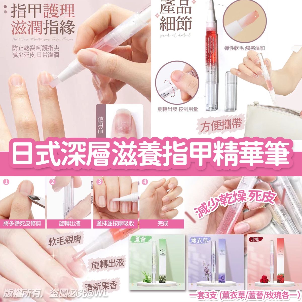 日式深層滋養指甲精華筆(一套3支) ❌❌截單日:8/8/2024 or 售完即止 💰$38/套;2套以上$28/套 🚚🚚到貨日:10月下旬 依家低至$28,平均每支 $9 蚊😱😱 ~陣陣香味,可以防止死皮 指甲從而靚番哂~滑一滑😘 ✅親膚舒適不扎皮膚 告別倒刺 預防死皮 滋潤指緣 ✅有效改善指甲邊緣粗糙乾燥 ✅隨心選擇 讓香氣瀰漫指尖 ✅和乾燥指甲問題說 NO~ ✅有機堅果油-鎖水滋潤 易吸收不刺激 ✅維生素E-補充養分 免受陽光傷害 ✅有機荷荷巴油-有效緩解皮膚乾燥 規格:一套3支(薰衣草/蘆薈/玫瑰)