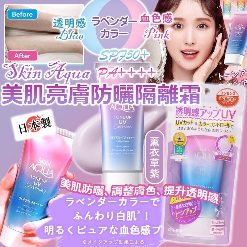 日本製 🇯🇵Skin Aqua 美肌亮膚防曬隔離霜 80g ❌❌截單日:16/5/2024 💰$69/件;2件以上$59/件 🚚🚚到貨日:7月中下旬 美肌防曬,提升透明感, 一掃暗沉 😉😉好似搽左粉底咁自然亮白😍😍 🇯🇵日本NO.1 Skin Aqua 美肌亮膚防曬隔離霜SPF50+ PA++++ 😸😸勁受日本OL 歡迎, 🏆日本Cosme美妝大賞 No.1 🏆 💕超強防曬、提亮膚色、透明美肌 、清爽保濕💕 ☀夏日必呀!! 😣唔想成面雀班又黑蚊蚊, 返工出街前一定要搽防曬😃😃 🇯🇵日本最新出品絕色美顏UV!! 唔單止高度防曬, 💦防水防汗, 最正係佢可以調節及提亮膚色👍👍 搽完皮膚光澤左, 滑溜左, 好似搽左透明粉底咁, 非常自然透白✨✨ 望落去成個人精神好多😙😙,啱曬我呢D貪靚又唔想搽粉底嘅懶人😁😁 💦仲加埋保濕精華,令肌膚保持水潤! 唔會好似其他防曬咁, 搽完皮膚一達達, D乾紋走曬出黎🥹🥹 ☀超微細珠光閃粉提升光感,一抹打造具透明感嘅自然亮白美肌! ☀日本最高防曬基準PA++++及SPF50+,強力抵禦UVA及UVB! ☀蘊含透明質酸、維他命C誘導體及百香果保濕精華,令肌膚保持水潤! ☀性質溫和,通過過敏性測試 ☀防水防汗 ☀淡淡花香清新宜人。 ☀無防腐劑、無礦物油 ❣️使用方法: 取適量並均勻塗抹於面部或全身,必要時請重覆使用以確保防曬效能 -規格︰80g -顏色︰薰衣草紫 (白皙明亮) -產地︰日本🇯🇵