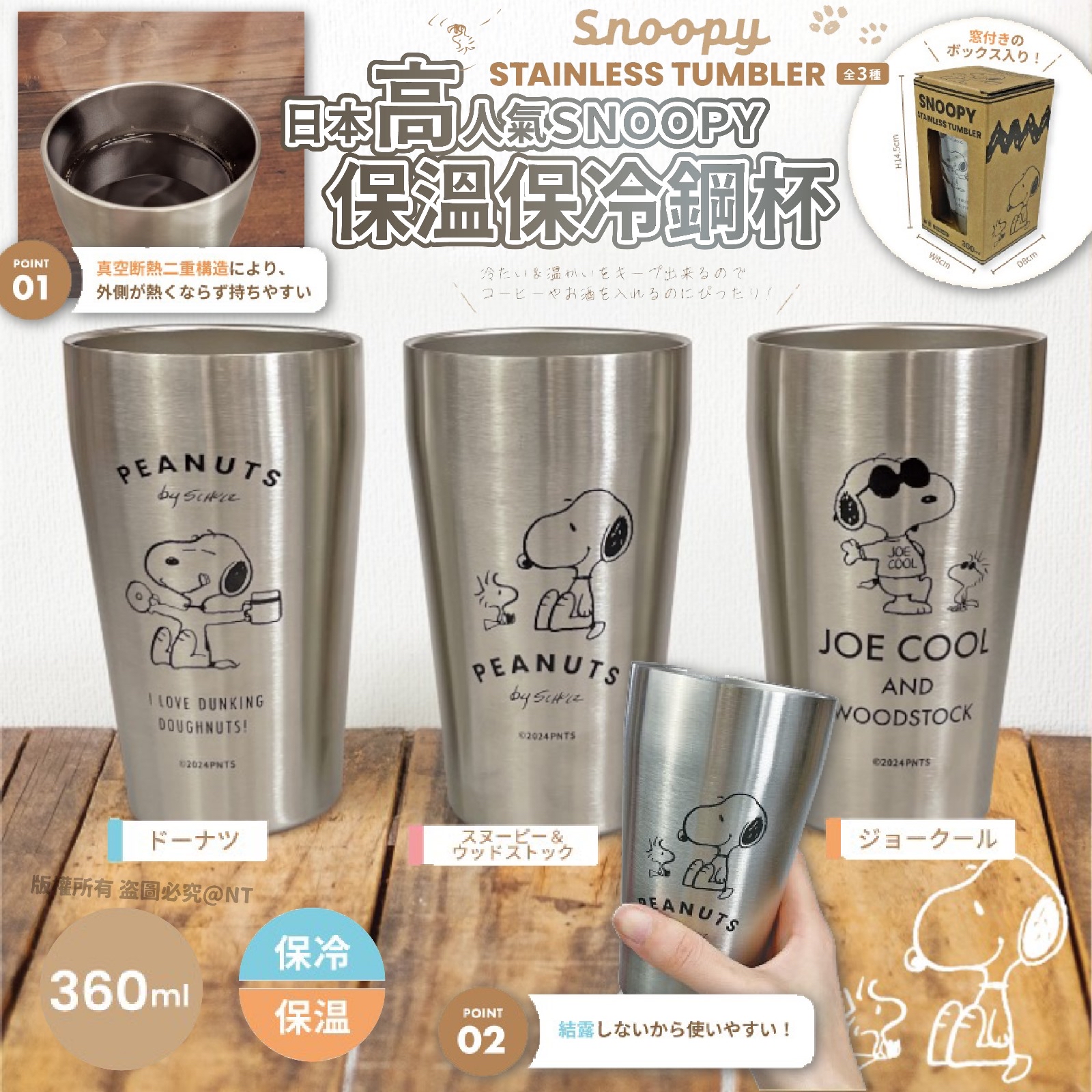 日本🇯🇵高人氣SNOOPY保溫保冷鋼杯(360ml / 款式隨機) ❌❌截單日:3/6/2024 💰$59/個;2個以上$49/個 🚚🚚到貨日:8月中下旬 開團啦 ~ ~ 開團啦🥤🥤 ❤️雙層不銹鋼斷熱構造,保溫保冷都OK,仲有CUTE CUTE SNOOPY陪住你😂 低至$49/隻😌👍🏻超抵‼️ 雙層不銹鋼斷熱構造有咩好⁉️ ✅保冷不結露、不滴水 ✅保溫不燙手好握 而且仲係廣口設計好放冰塊、茶包🥤 泡冷熱咖啡、熱紅酒或夏季冰涼啤酒汽水尺寸都好正💯 ✨附精美外盒 送禮自用都OK‼️ 📌容量:360ml 📌尺寸:本體直徑7.5cm 高13cm(3款隨機出貨) 📌材質:不銹鋼、PET 📌產地:日本品牌,中國製造 ‼️使用注意: 🚫不可放洗烘碗機、不可放微波爐。 🚫請勿放入冰箱、冷藏冷凍室。