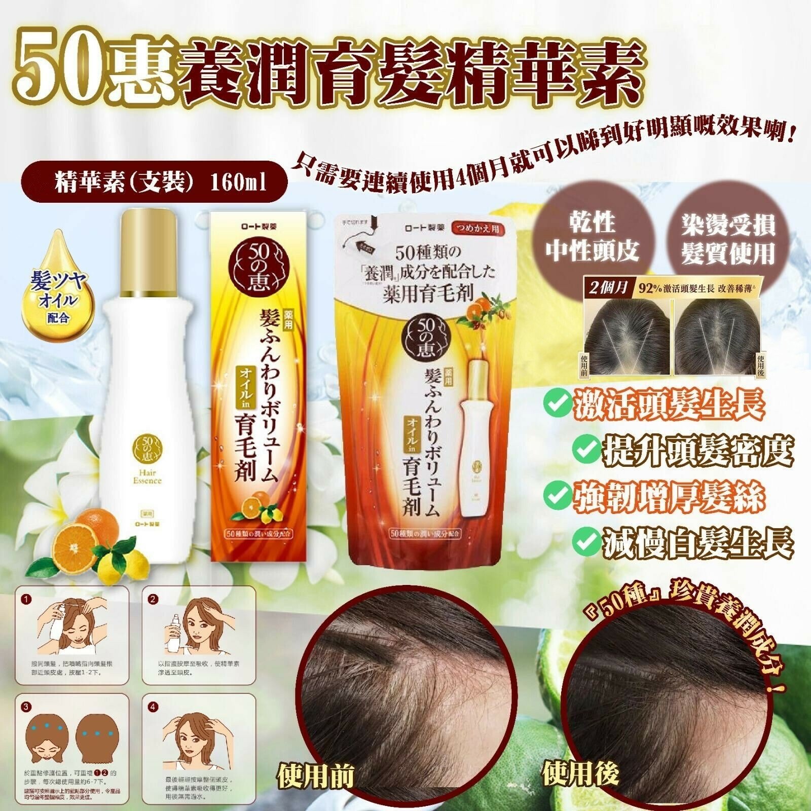 日本🇯🇵50惠養潤育髮精華素 ❌❌截單日:16/6/2024 支裝:$215/支;2支以上$205/支 🚚🚚到貨日:7月中下旬 頭髮稀薄無力⁉️容易扁塌💔 多位藝人力推育髮既Supplement👍👍👍真人實測4個月顯著見效‼️ 減少甩頭髮達32%💃秀髮濃密豐盈🇯🇵日本厚生省認證🏆50種珍貴成分👉人參、蠶砂、地榆、透明質酸及當藥等 ✨天然成份(安心使用) ✨不含雌激素/𣎴影響荷爾蒙 ✨𣎴含礦物油/合成顔料 ✨不含MIT/CMIT防腐劑 ✨不含油離甲醛及二噁烷/不刺激皮膚 ⭕高效減少掉髮 ⭕激活頭髮生長 ⭕提升頭髮密度 ⭕強韌增厚髮絲 ⭕減慢白髮生長 每日早晚各一次 (免沖洗) -產地:日本 🇯🇵 -規格:(支裝) 160ml -保存方式:避免陽光直射,請置於陰涼乾燥。 -注意事項: ※請確保將產品放在孩童和寵物接觸不到的地方 ※使用後如有不適,請暫停使用並諮詢專業醫師 ※如不小心噴到眼睛,請用清水沖洗10-15分鐘後,請立即就醫諮詢專業醫師