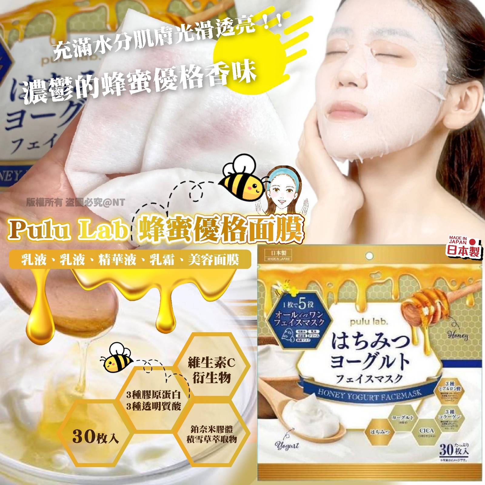 日本🇯🇵Pulu lab.蜂蜜優格面膜(一包30入) ❌❌截單日:5/5/2024 💰$59/包;2包以上$49/包 🚚🚚到貨日:7月下旬 日本pulu lab.|🍯5合一精華面膜🟰化妝水➕乳液➕精華液➕乳霜➕面膜🍦 🧏🏻♀深層濕潤每寸肌膚💦,打造豐盈、緊緻、美麗肌膚 原價$98/包,限時激減低至$49/包,一包有30片架😉😉 🌟蜂蜜——補充多種微量元素,恢復細胞活力 🌟優格——有效溫和軟化 & 去除老廢角質,加快角質更新,直達肌底,層層修補損傷,恢復柔嫩細緻潤澤肌膚 🌟種膠原蛋白 & 種透明質酸——深入肌底,修補組織,逐層補水撐起肌膚 🌟維生素C衍生物——抑制 & 還原黑色素的形成,支持膠原蛋白增生 & 緊緻肌膚 🌟CICA積雪草萃取物——抗菌消炎、快速舒緩、鎮定,增強⾃⾝修復能⼒ 🌟鉑奈米膠體——協作將美容成份穿透至肌膚底層,強化各成份作用於角質層的功效 ◾容量:一包30入,約360ml ◾原產地:日本製造