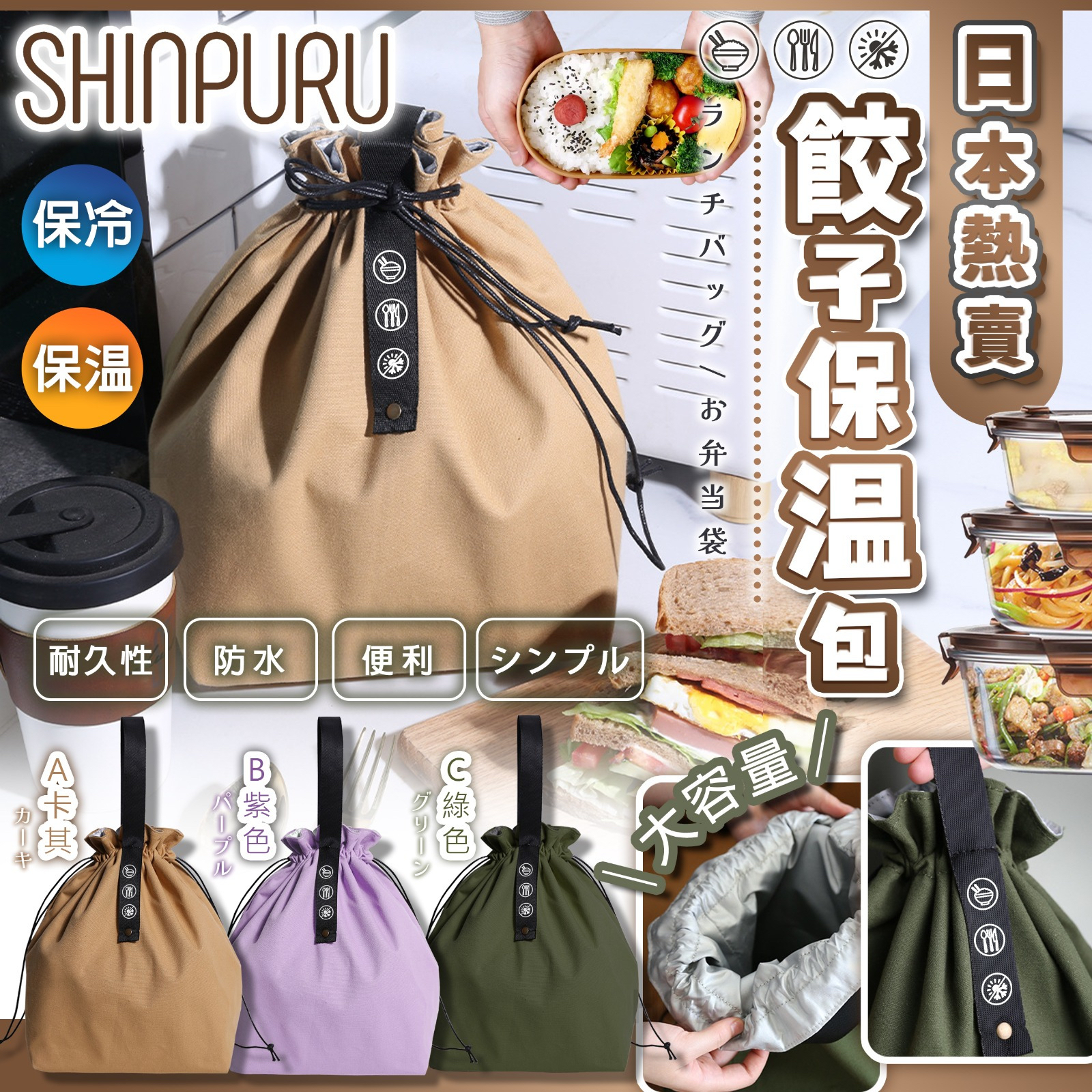 日本🇯🇵SHINPURU餃子保温包 ❌❌截單日:14/5/2024 💰$49/個;2個以上$39/個 🚚🚚到貨日:7月中下旬 款式選擇:A) 卡其色 / B) 紫色 / C) 綠色 ☑️保温+☑️保冷,用黎帶飯岩晒~ 原價$139,現時低至$39/個😘😘 ✅容量大,可以放到大SIZE嘅微波爐飯盒,平時去街巿超巿買冷凍食物都啱用 ✅內裏鋁質層保冷之餘容易清潔 ✅索帶設計,拎出街時尚又可愛~ 顏色︰ A) 卡其色 B) 紫色 C) 綠色 ◾材質/外層材質:65% 棉35%+聚酯纖維,內側鋁質 ◾尺寸︰長20cm*寬13cm*高30cm