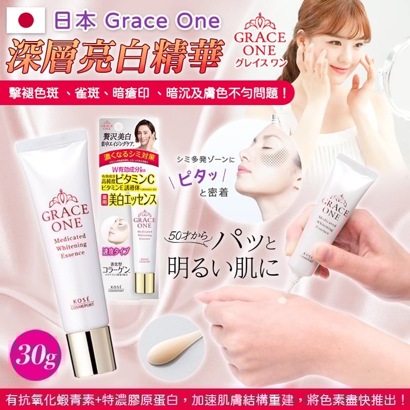 *日本 Grace One 深層亮白精華 30g* ❌❌截單日:1/7/2024 💰$76/件;2件以上$66/件 🚗🚗到貨日:9月中下旬 速攻解決❌黑斑、❌色斑、❌雀斑❗ 🇯🇵日本Grace One 皇牌產品🎉深層亮白精華,香港賣緊$1xx 👊擊褪✨色斑 ✨雀斑✨暗瘡印 ✨暗沉及 ✨膚色不勻問題👌 整體提升肌膚透亮度 20%✨日本一出就瘋狂爆單❗未試過一定要試 💕 到左35歲,D色斑就開始浮出黎😫尤其係生完BB,加埋☀️陽光伴隨黑色素入侵,塊面變得又黃又多雀斑😭 淨係搽防曬都唔掂,要加埋呢支美白精華,就可以解決以上嘅歲月黃問題👍好多明星都推介使用就知係好野😬 GRACE ONE 皇牌產品深層亮白精華💁🏼♀️專為熟齡肌而設👊 可以重點用於受光最重的顴骨位置 ✅防止色斑雀斑 ✅速攻打散黑色素 ✅含抗氧化蝦青素+特濃膠原蛋白 ✅加速肌膚結構重建,將色素盡快推出 只要早晚Keep住揸,⭕️美白透亮⭕️保濕❌去黃❌去印❌淡斑,完全無難度。 白白滑滑係靚靚都想要啦🥰要靚靚皮膚一定要夠勤力💪🏻 -規格︰30g -產地︰🇯🇵日本