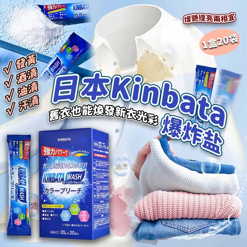 日本 Kinbata 爆炸鹽 (1盒20袋) ❌❌截單日:23/5/2024 💰$49/盒;2盒以上$39/盒 🚚🚚到貨日:6月中下旬 #好物分享 #KINBATA #白衣救星 📌為什麼白色衣物放久了會發黃變髒…洗都洗不掉 因為衣服穿久了,人體會分泌油脂、流汗產生黃漬/洗滌時殘留的渣滓,衣櫃潮濕白衣物放久就會發黃。 📌每個人或多或少都會有這種困擾,吃飯聚餐衣服上會沾上油點,辣椒點洗都洗不掉,尤其是小孩子衣服最容易弄上油漬、奶漬、果汁。 用刺激的漂白粉還容易將衣服洗壞,傷手,洗不掉的衣服只能扔掉,喜愛的衣服就這樣毀了... ✅針對衣物染色+發黃+變暗+頑固污漬 ✅核心成分是活性氧污漬分解因數,溫和不刺激 ✅能在瞬間祛除洗衣粉難以祛除的多種頑固污漬 ✅同時清楚細菌和異味,且不傷衣物纖維,省時省力 ❌不含次氯酸鈣、甲醛、磷、螢光劑等刺激性成分 -規格:1盒20袋