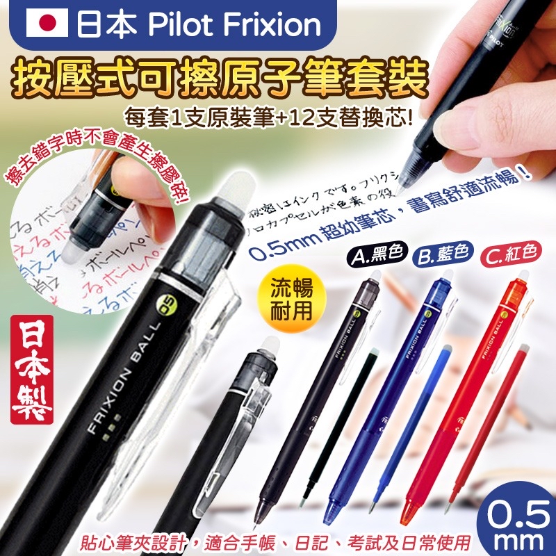 日本 Pilot Frixion 按壓式可擦原子筆套裝 ❌❌截單日:2/7/2024 💰$79/套;2套以上$69/套 🚗🚗到貨日:9月中下旬 A.黑色 B.藍色 C.紅色 💕真心推介|返工返學必備💕 #勁抵買 (1支原裝筆+12支替換芯) 鍾意點改就點改 一擦即甩,不留痕跡😂 可擦原子筆真係一項重大發明⭐以前填表、考試、抄NOTES 最怕寫錯字, 因為用塗改液下下等佢乾先可以再寫,浪費時間又唔環保 ✅Pilot Frixion 可擦式技術,加埋今年新出嘅按壓款式,可隨心作出更改 ✅輕輕一擦, 筆跡消失得無影無蹤,擦去錯字時不會產生擦膠碎,0.5mm 超幼筆芯,書寫舒適流暢 ✅貼心筆夾設計,適合手帳、日記、考試及日常使用 -規格:每套1支原裝筆+12支替換芯 -產地:🇯🇵日本
