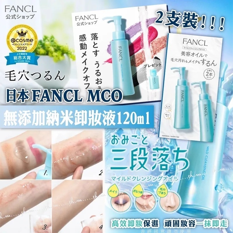 日本FANCL MCO納米卸妝油孖裝 (120mlx2) ❌❌截單日:17/5/2024 💰$163/套,2套或以上$158/套 🚚🚚到貨日:6月中旬 採用MCO納米速淨技術👍微細分子能將化妝品浮起🥰潔淨👁眼部👄唇部👉不殘留化妝殘漬👍加水後乳化🤩高效溶解毛孔內的堆積油脂及角栓,💦潔淨同時去除氧化物,預防肌膚因化妝或搽左防曬而老化變黃。有效抗氧化👍🏻 卸妝同時去除面上黃氣,面部肌膚幼滑剔透😘 🌿產品成分: 🍃綠茶兒茶素油🌹玫瑰果油🥥椰子保護油💐白芒花籽油,完美複合精油👉油份+卸妝成份的最佳比例 💥「白芒花籽油」來自綠地上的白泡沫,溶解角栓展現絕佳潔淨力!👉🏻溫和洗淨 護膚無負擔 💥「完美複合精油」呈現了卓越卸除力,頑強彩妝或看不見的髒污都能迅速卸除👉🏻迅速溶解 惱人角栓不存在 💥「油份+卸妝成份的最佳比例」獨有保濕潔淨配方,堅持在洗淨時,溫和不刺激,肌膚底層仍擁有滿滿滋潤 使用方法: 將約1元硬幣大小的潔顏油塗抹在臉部,用指腹以畫圓的動作由下而上的方向輕輕按摩全臉肌膚,溶解彩妝及污垢。再用清水沖洗乾淨, 沖洗過程中同時乳化 -產地:日本 -保存日期:2026年5月或之後