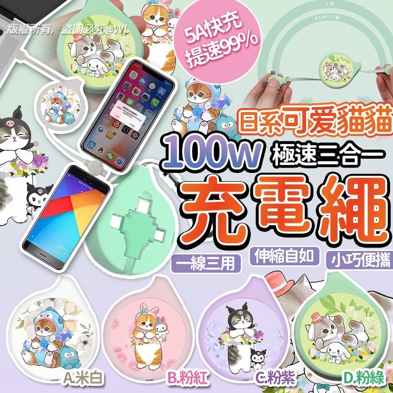日系貓貓最新100w極速一拖三三合一充電繩 ❌❌截單日:19/5/2024 💰$48/個;2個以上$38/個 🚚🚚到貨日:8月中下旬 今次搵到勁新款😘 100w 5A 充電線,極速充電,一個細細粒已經有齊不同頭,外出使用十分方便呢 ~ 😍可同時充2個電話😍 居家要有條快既充電線又三合一好緊要架😉 🙌今次哩款一條線有3個頭 可以同一時間充2部電話~ ✅iphone ✅Type-C ✅Android 💓一線三用 💓伸縮自如 💓小巧便攜 💓柔韌耐用 💓5A快充 提速99%📈 4款可選: A) 米白色 B) 粉紅色 C) 粉紫色 D) 粉綠色 📌保存方式:避免陽光直射,請置於陰涼乾燥。 📌注意事項: ※請確保將產品放在孩童和寵物接觸不到的地方。