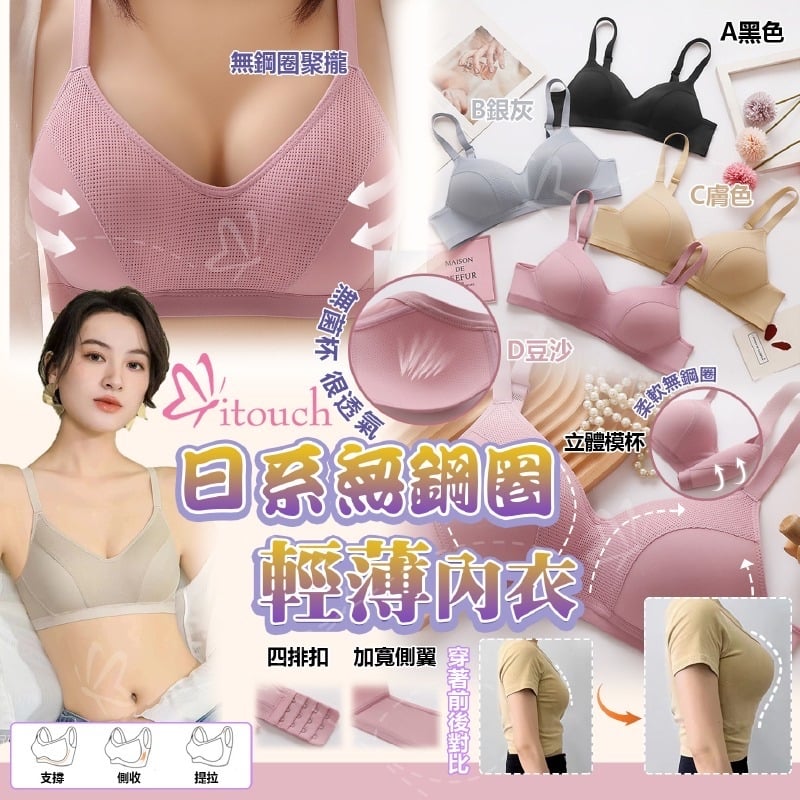日系I-TOUCH 無鋼圈輕薄內衣 ❌❌截單日:10/7/2024 💰$39/件;3件以上$29/件 🚗🚗到貨日:8月上中旬 #無鋼圈的舒適穿過才懂 #擺脫鋼圈的壓迫束縛 👙日系無鋼圈輕薄內衣 ꒰ 裸感舒適👙꒱ ✅潤膚無菌杯 不悶熱很透氣,穿著運動也OK ✅無鋼圈也能修飾胸型 好好收拾多餘的肉肉,拒絕傳統內衣的束勒 ✅聚乳集中機能 不會產生副乳和變形,集中也能很舒適 穿上舒適的日系無鋼圈輕薄內衣👙 柔軟舒適零束縛,自由自在做自己😊 🌈顏色:銀灰、豆沙、膚色、黑色 🌈尺碼:36、38、40 🌈建議胸圍罩杯:B-C杯 🌈肩帶:可調節 🌈排扣:四排三扣 🌈顏色:銀灰、豆沙、膚色、黑色 📐尺碼: 36/80BC 38/85BC 40/90BC 42/95BC