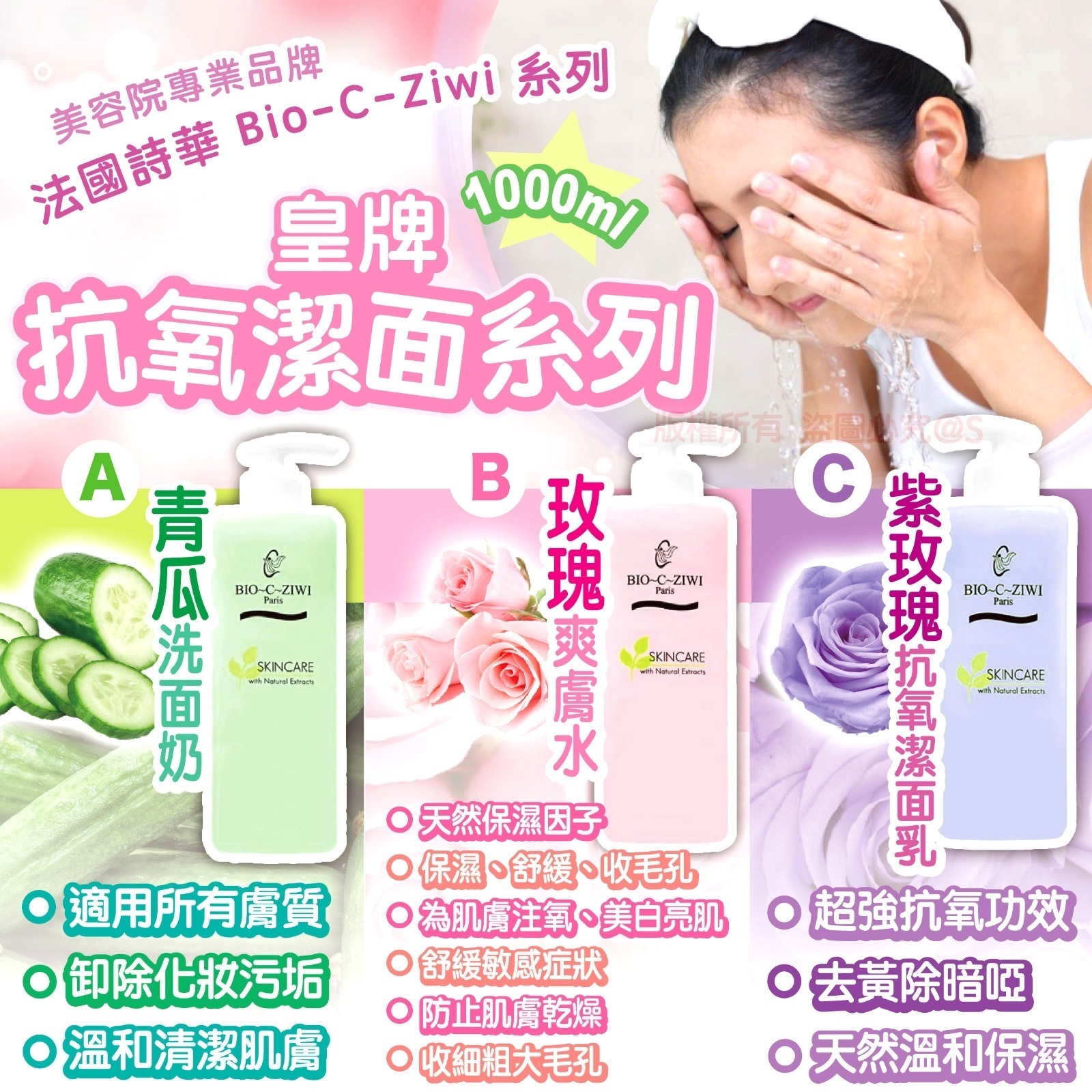 法國詩華 BIO-C-Ziwi洗面爽膚系列 ❌❌截單日:23/5/2024 優惠💰$98/支,2支以上$90/支 🚚🚚到貨日:7月中下旬 美容院專用👉巨無霸 1000ml 優惠裝🉐🉐 A. 🔵皇牌青瓜洗面奶 (綠色) B. 🔴玫瑰爽膚水(粉紅) C. 🟣紫玫瑰抗氧潔面乳(紫色) 法國詩華係一個美容院專業品牌,好多美容院都用佢架👏👏 🔵洗面奶 - 1000ml ✅美容院專用 ✅所有膚質適用 ✅有清爽嘅青瓜/玫瑰味 ✅含青瓜萃取液、牛油果精華、玻尿酸 / 紫玫瑰萃取液,乳木果油,,尿囊素 ✅質地柔滑,能溫和清潔肌膚,能卸除面上化妝污垢,令肌膚感覺細緻潔淨 ❌不含酒精、合成香精、動物成份 質地:乳狀,唔起泡,好溫和💦 用法:早晚使用,取適量塗於臉部和頸部,輕輕按摩,再用清水洗淨 🔴玫瑰爽膚水 - 1000ml ⭕含玫瑰提取物、透明質酸、天然保濕因子 ⭕有效保濕、舒緩、收毛孔 ⭕為肌膚注氧、美白、去走黃氣 ⭕舒緩敏感症狀 ⭕防止肌膚乾燥 ⭕收細粗大毛孔 ⭕美白亮肌 轉季敏感,皮膚紅哂,用化妝棉加玫瑰爽膚水💧💧敷下塊面,即時舒緩敏感嘅肌膚👏👏 用法:潔面後,可以將爽膚水輕拍在面上直接吸收 容量:1000ml @ 保存期:至2025年