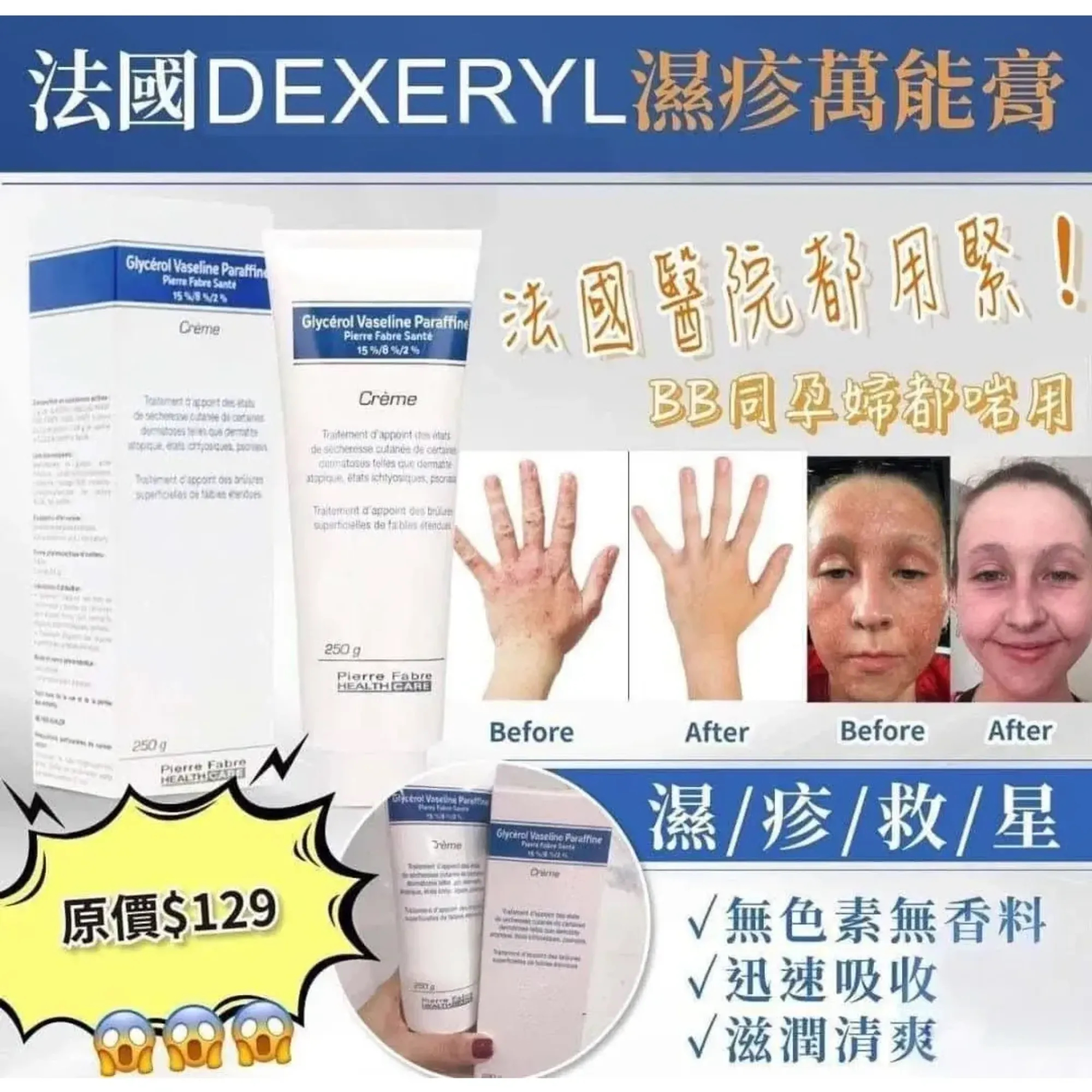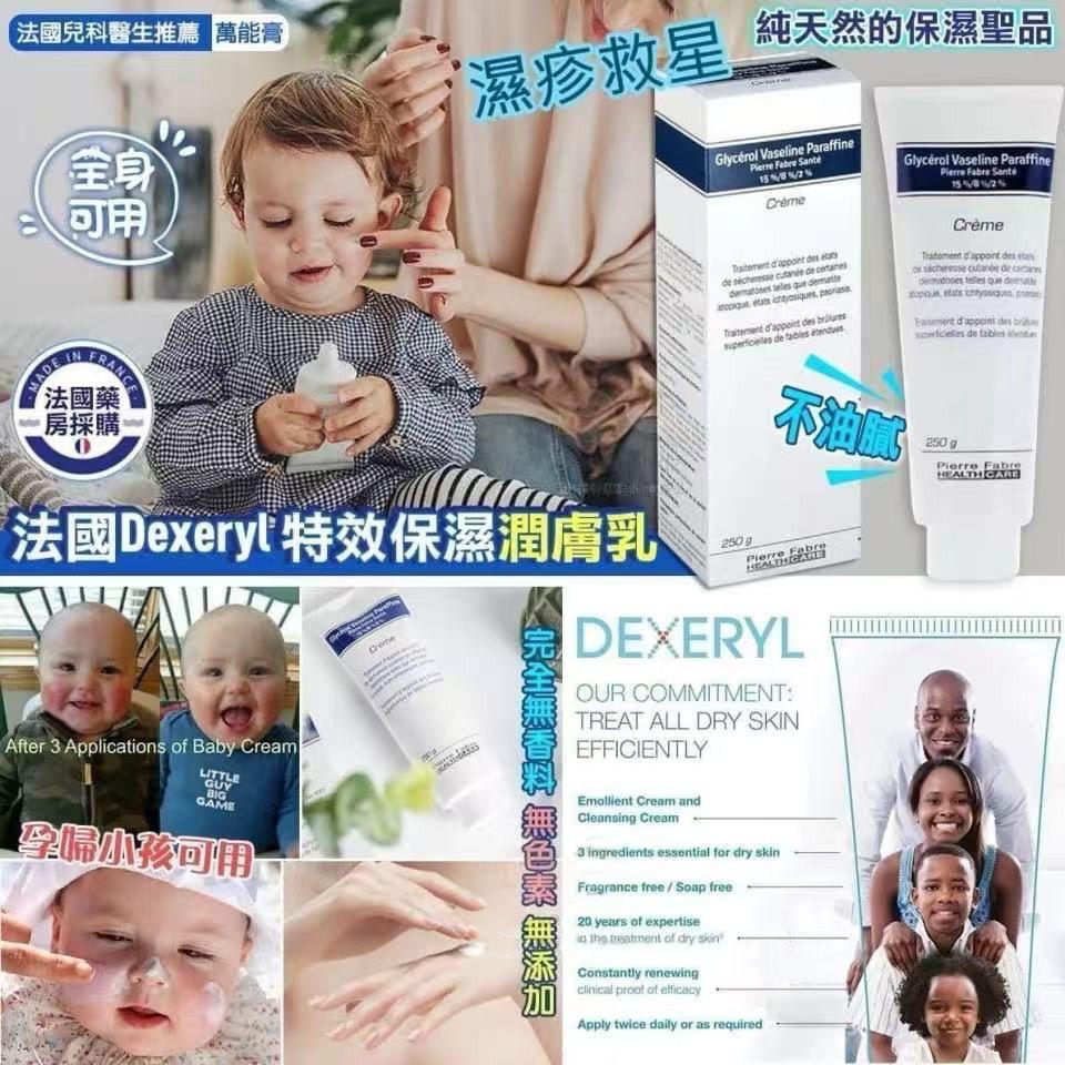 法國🇫🇷Dexeryl濕疹萬能膏 250g ‼️售完即止 😱原價$129❌❌ 😱店主優惠💰$65/支,2支以上$59/支 🚘2-3星期到貨 斷貨皇濕疹救星😳好難訂架!! 🇫🇷 法國皮膚科醫生推薦! 原價$129😱 🙌🏻純天然嘅保濕聖物💦💦任何年紀 (包括👶🏻嬰兒、孕婦) 都可以用 轉天氣, 濕疹好容易覆發😖😖。又痕又甩皮, 真係好辛苦😭😭 呢支濕疹 萬能膏👨🏻⚕️經皮膚科醫生証實, 能輔助濕疹等皮膚問題, 改善皮膚乾燥裂痕🉐🉐,質地是乳液狀,好快吸收,保濕度高👍 ✅大大支,✅價錢平,✅超抵用,必須再推介 👍🏻👍🏻👍🏻👍🏻精明媽媽的不二選擇 喺🇫🇷法國,好多家庭醫生都會建議家中常備一支Dexeryl creme,它被稱為萬能霜。 在法國🇫🇷屬於人人手上一支的平民產品 🔹 產品介紹 🔹 由法國 🇫🇷Avene 同廠出品,法國注冊商標的藥妝護膚品。 用於濕疹,皮炎,牛皮蘚及淺表性燙傷的輔助治療。BB皮膚乾燥,使用效果更好,是法國醫生推薦的寶寶濕疹用保濕產品之一。此產品也是經當地皮膚醫生和兒科醫生一致推薦的,針對乾性/ 缺水皮膚而研製,產品無色無味,純天然配方研製,可作嬰兒平日的潤膚乳使用。 每日一到兩次或按需要。 🔹 建議用法 🔹 1. 嬰幼兒潤膚用(日常護理可用臉和身上,既護理皮膚又防濕疹) 2. 嬰幼兒治療濕疹用(效果很好,在法國的孩子得了濕疹,此產品必是首選) 3. 成人潤膚用(本品保濕效果非常好,可用在臉部保溫打底用和身體乳.) ✅無色素 ✅無香料 ✅吸收迅速 ✅不油膩 ✅清爽柔 EXP : 2026/03 -規格:250g -產地:法國🇫🇷