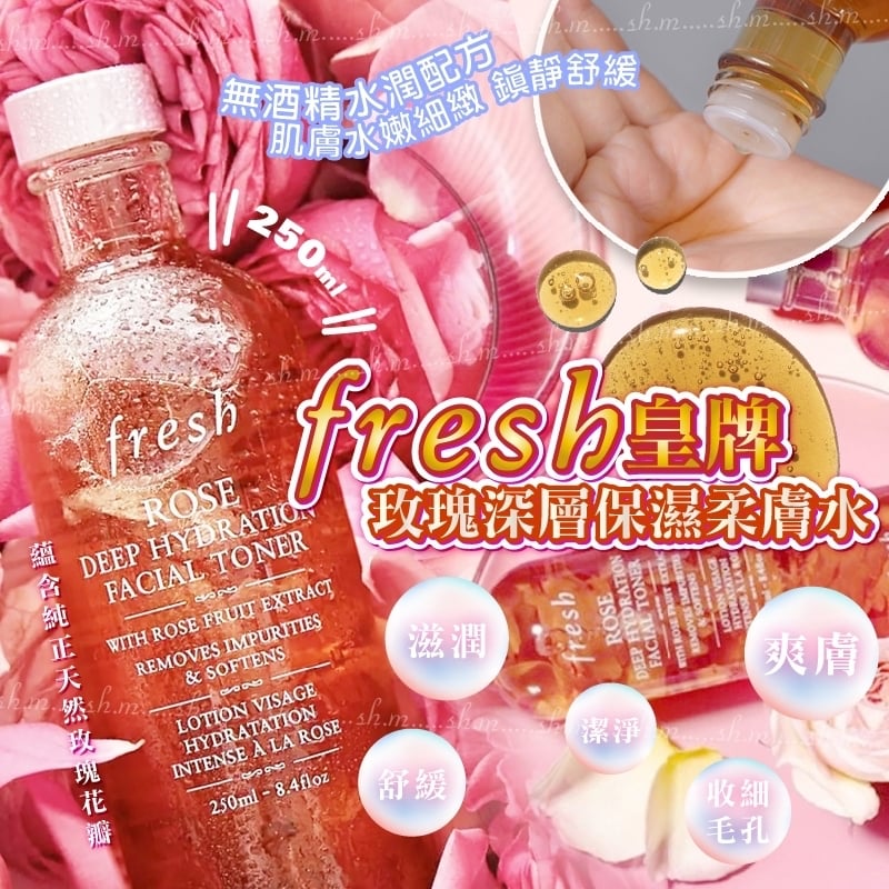 法國 Fresh 玫瑰深層保濕柔膚水250ml ❌❌截單日:25/7/2024 💰$188/支;2支以上$178/支 🚗🚗到貨日:9月中下旬 🛍️專櫃賣緊$370/支😉而家差唔多半價🈹🈹🫠 低至$178/支🥳🥳限量減‼️售完即止‼️‼️ Fresh 玫瑰深層保濕柔膚水250ml 注入純正🌹天然玫瑰花瓣配方溫和,有效軟化膚質及細緻毛孔 👏🏻👏🏻 為肌膚長時間保持水潤飽滿,高度滋潤肌膚長達6小時 這款暢銷玫瑰深層保濕柔膚水為無酒精配方,具有無與倫比的玫瑰成份組合:爽膚玫瑰果萃取、舒緩玫瑰水、滋養玫瑰油和純正天然玫瑰花瓣。它可以滋潤並清除皮膚上的殘留雜質,使其如絲般柔軟,並為你的其餘護膚程序做好準備。 🉐用棉花敷3分鐘後 💦水份升至88% 👏🏻👏🏻 經科學測試,證明使用後肌膚水分提升46%,高度滋潤肌膚長達6️⃣小時💗 100% 測試者表示有助去除肌膚表面上環境污染物及化妝品等污垢 97% 感覺肌膚柔軟清新 94% 認為肌膚更幼滑 90% 表示肌膚得到舒緩 💟透明質酸 能吸收和保持水分,達到豐盈的效果 💟當歸葉萃取 有助保濕 💟玫瑰果萃取 以其爽膚特性而聞名 💟玫瑰水 有鎮靜和舒緩肌膚功效 -規格:250ml -保存期限:2025年7月(商品銷售速度快,依實際出廠為主。) -保存方式:避免陽光直射,請置於陰涼乾燥。