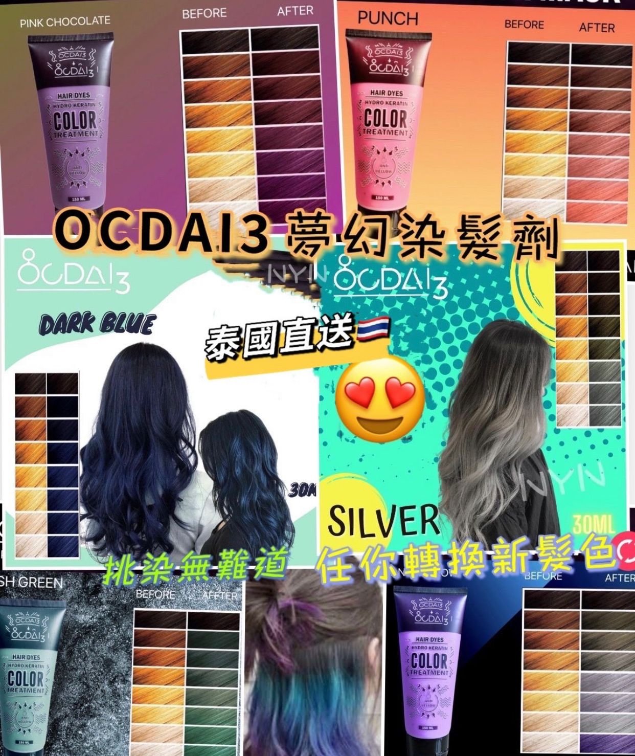 泰國🇹🇭OCDAI3 Hair Dye Color Treatment夢幻染護髮劑 ❌❌截單日:5/6/2024 💰$85/支;2支以上$80/支 🚚🚚到貨日:8月中下旬 #打呢個牌子google下就知呢個牌子係正野😉😉 泰國明星級💫SALON店專用🌈 #用過之後返唔到轉頭 🤩超級正 #泰國最Hit 護髮髮髮劑 #顏色超靚 #勁易上色🎨 #黎緊新年轉換新髮色啦 👍護髮嘅同時亦能夠染髮💆💆,顏色效果仲維持2個月架 唔想成頭染,挑染係一個非常唔錯嘅選擇💃💃 ❌無損傷❌無刺激❌無異味✅超自然 最緊要係自己屋企染, 勁簡單容易,, 唔駛下下都要去髮型屋 呢款泰國明星專用染髮劑, 染完後頭髮順滑度和光澤度都有5粒星星⭐⭐⭐⭐⭐ 唔似出面果D, 染完之後頭髮雖然有顏色,但係非常毛燥🙈🙈。 最特別係染髮劑好似護髮素咁,好容易滲透每一條頭髮,所以唔使技巧就可以搽得好均勻。唔駛搵人幫手一層層咁掃上去, 自己一個人都可以輕易完成🉐🉐 只需一抹一刷即上色 ✅柔順 ✅提亮 ✅防分叉 ✅修復受損髮質!即刻提升顏值 多色可選: A) Pink Chocolate 紫紅色系 B) Punch 啡粉色系 C) Dark Blue 藍色色系 D) Ash Green 綠色色系 E) Violet 紫色色系 F) Silver 銀色色系 ➡️ 健康染髮,溫和不傷髮成分安全 ➡️ 操作簡單,效果超靚 (如本身有漂染過或髮色比較淺,顏色仲更加出色😻)