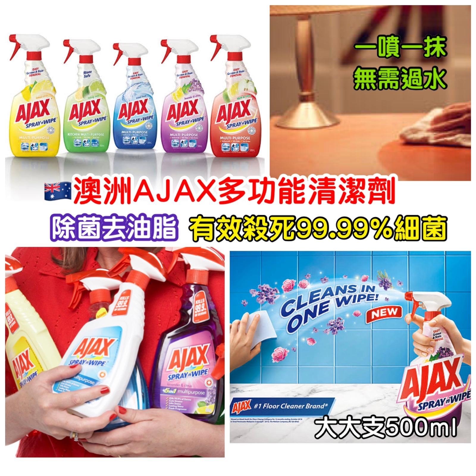 澳洲 Ajax 多功能清潔劑 500ml ❌❌截單日:22/7/2024 💰$39/支;3支以上$29/支 🚗🚗到貨日:10月中下旬 A.綠色檸檬味 (廚房專用) B.檸檬柑橘味 C.薰衣草柑橘味 D.海洋味 E.蘋果柑橘味 💨💨一噴一抹就乾淨 ❌❌不需要沖洗 🥊🥊有效殺死99.9%細菌 🇭🇲澳洲銷量No.1 呢一款澳洲性價比超高嘅多功能清潔劑,個個澳洲家庭都用佢㗎~~ 👍🏻👍🏻大大支,仲要有多種香味,成個屋企都用得 ✅噴霧式設計,易於使用和存放 ✅具有強大的除菌和去油脂作用 ✅可以迅速清理檯面上油脂、污垢和漬 ✅殺死 99.9%的細菌 ,包括沙門氏大腸桿金黃色葡萄球和腸球菌 ✨一噴一抹,不需要沖洗✨ -規格:500ml -產地:澳洲 -有效期︰2026年