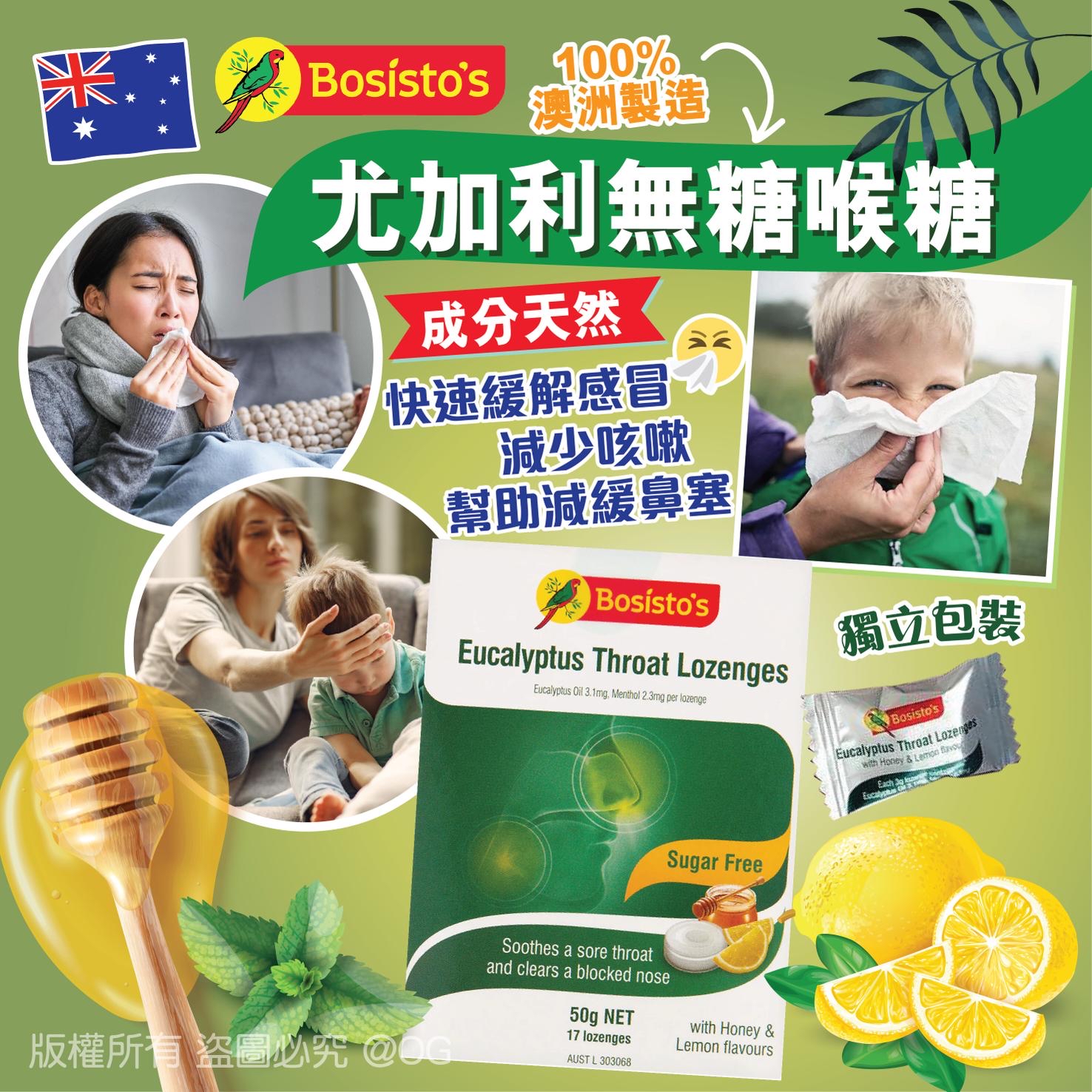 澳洲 Bosisto's 尤加利無糖喉糖 50g ❌❌截單日:24/6/2024 💰$45/盒;3盒以上$39/盒 🚗🚗到貨日:9月中下旬 採用純天然精華配方,溫和無刺激🤗 可以快速緩解感冒🤧等各種病因引起嘅咳嗽同通鼻塞😎 ✅舒緩喉嚨疼痛、減少咳嗽 ✅舒緩鼻子,使呼吸流暢 👉🏻尤加利樹精油 尤加利精油的味道通過鼻腔可幫助減緩鼻塞,使呼吸流暢 👉🏻蜂蜜 可以滋潤喉嚨與口腔,有助緩解咳嗽等症狀 👉🏻檸檬 宜人的檸檬味可與蜂蜜平衡,舒緩喉嚨 👉🏻薄荷醇 舒緩和鎮定,可使頭部及喉嚨得到舒緩 ✅成分天然 ✅不添加人工色素、香料、防腐劑 ✅無糖 ✅全獨立包裝 🌈主要成份:薄荷、尤加利、檸檬、蜂蜜 ❌無添加任何人工色素、香精、防腐劑 👍適合2歲以上兒童及成年人使用😊 -規格︰50g -產地︰澳洲